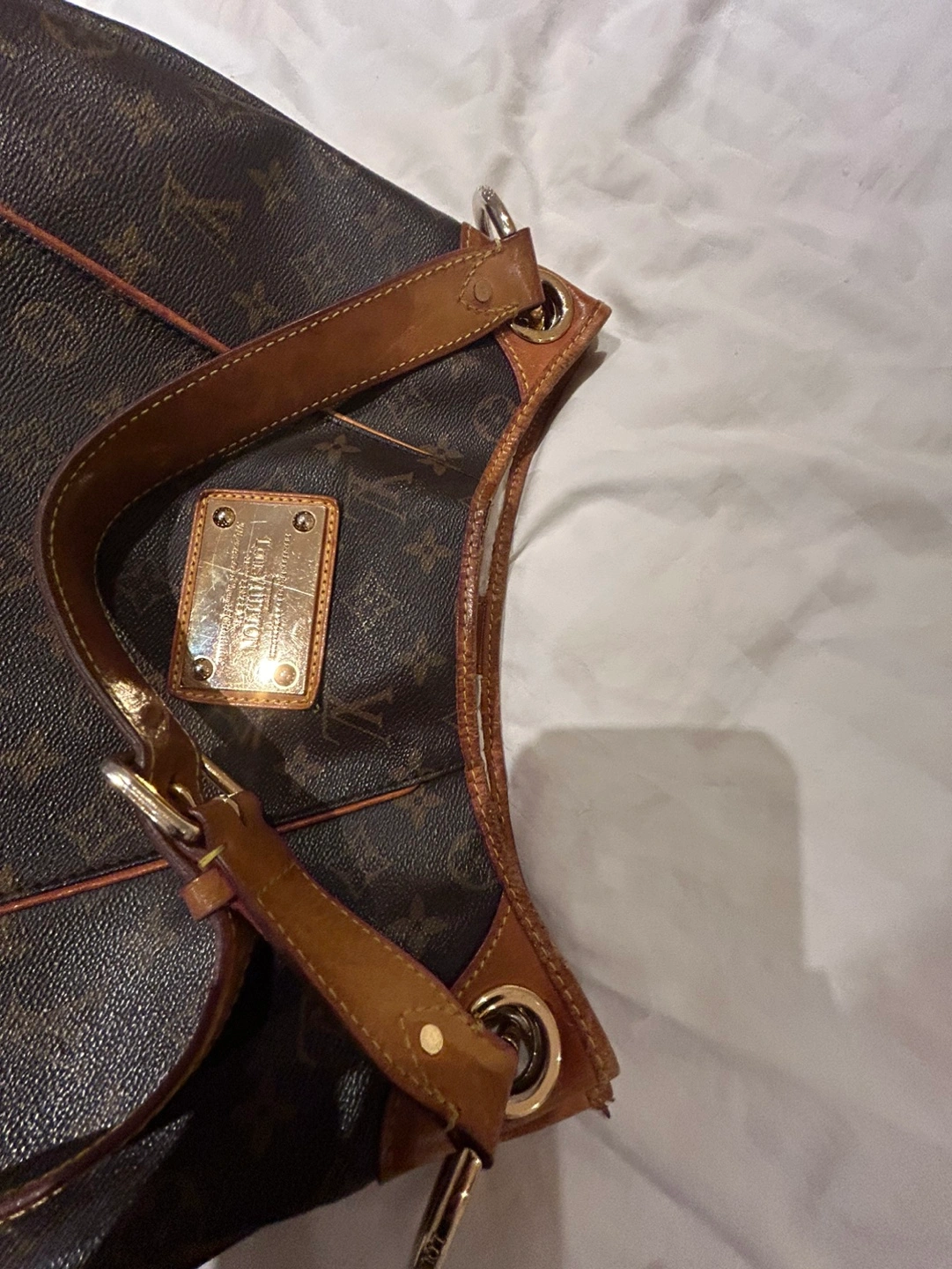 Used Louis Vuitton Monogram shoulder bag with gold hardware. Has a top handle, strap with a buckle and an interior pocket.