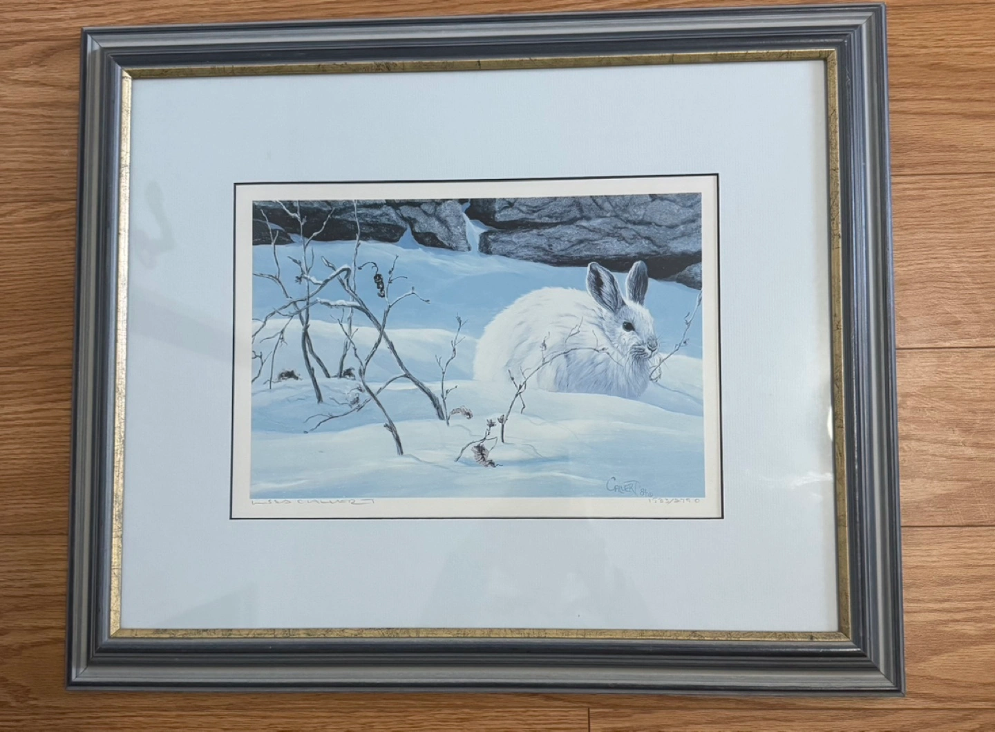 Framed print of a snowshoe hare in a snowy landscape. Signed by the artist Calvert.