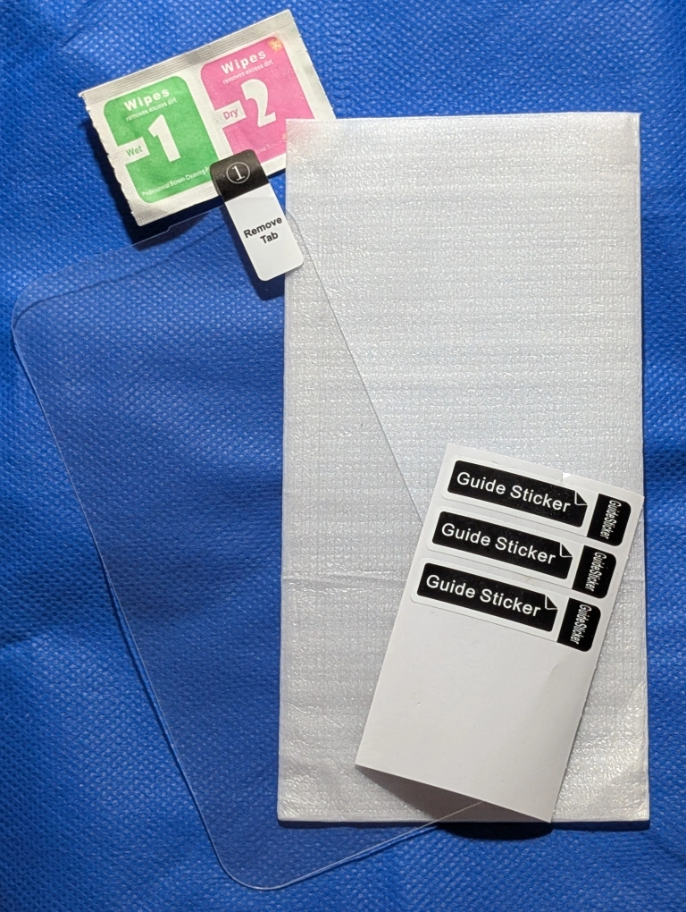 Screen protector with guide stickers, wet wipes, and dry wipes. The guide stickers help ensure accurate placement of the screen protector.