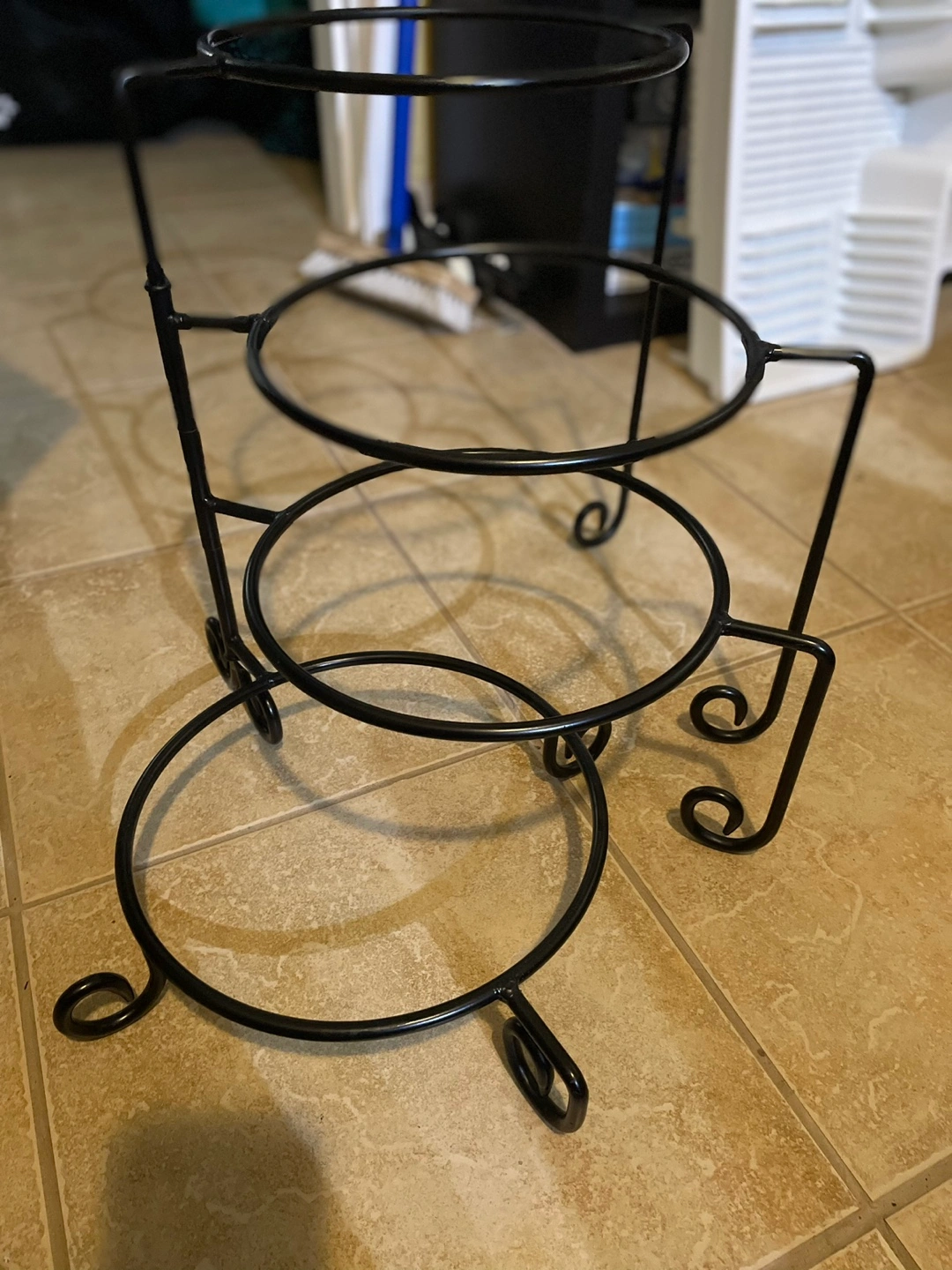 #freecycle 4 tier plate holder, plates not included. Sturdy black iron, not heavy. Close into itself for easy storage. Hoped to turn it into a decorative piece but never got around to it. Yours to enjoy.