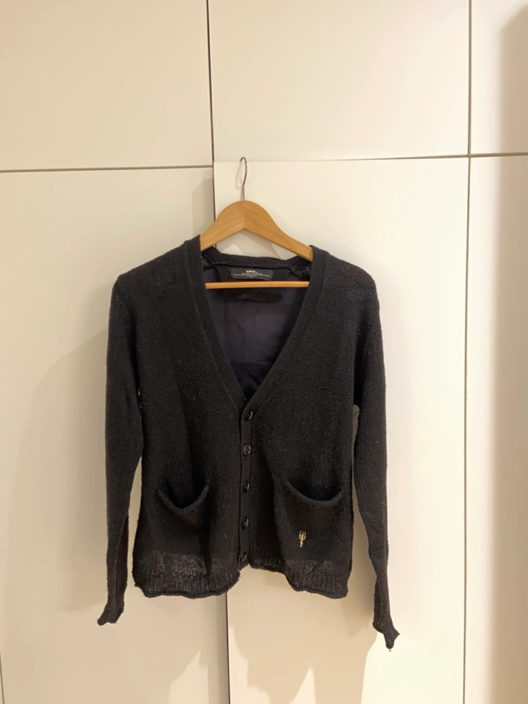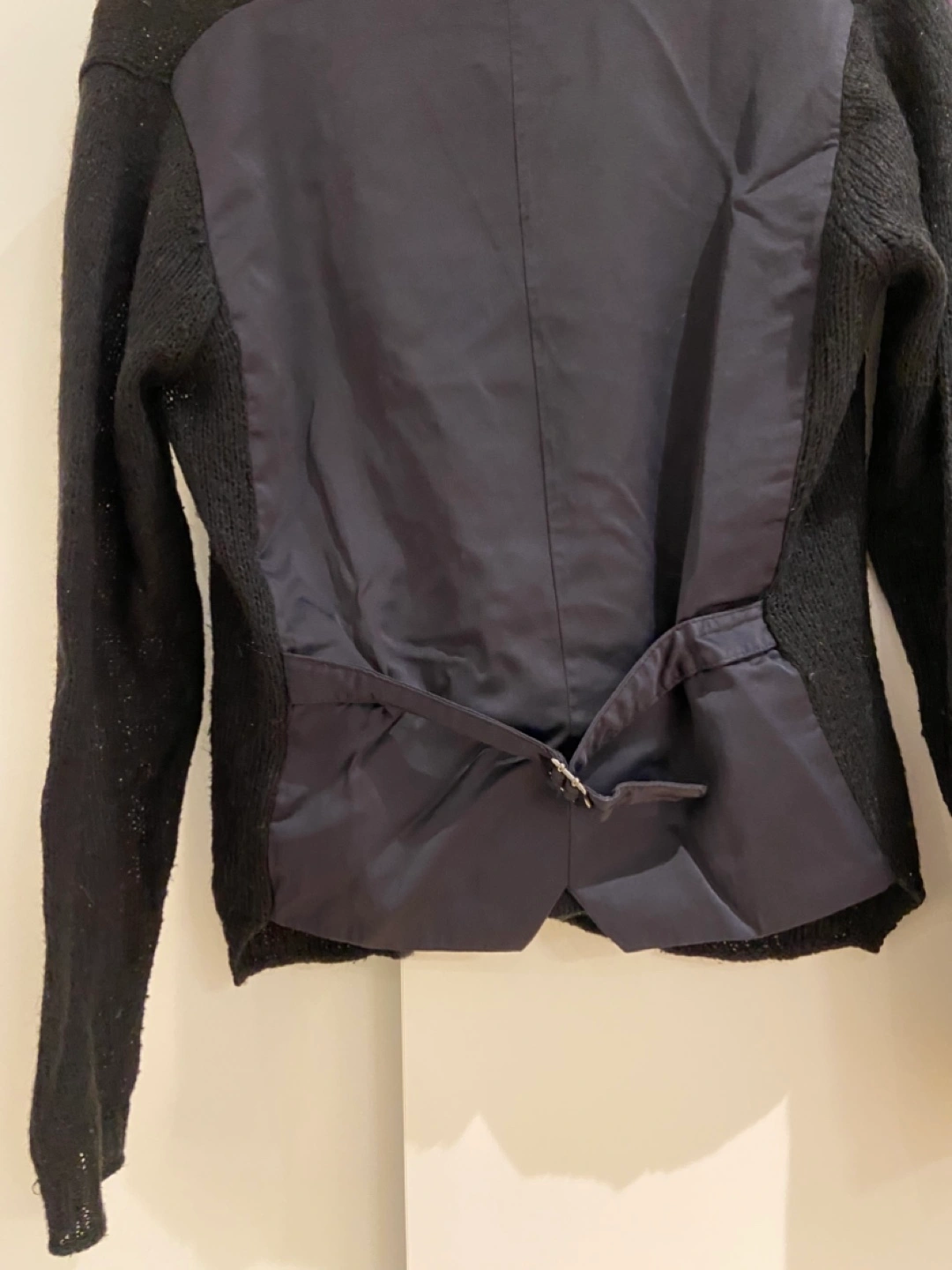 Navy Blue cardigan with a vest back. The vest is attached to the cardigan and features a button closure. The cardigan has two pockets and a V-neck. Initial cardigan Flat shoulder: 16 inches Chest: 19 inches Length: 24 inches Sleeve: 24 inches
