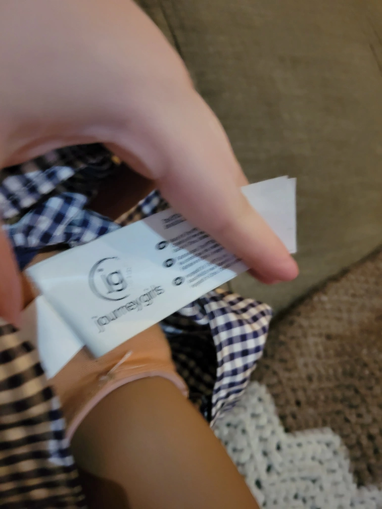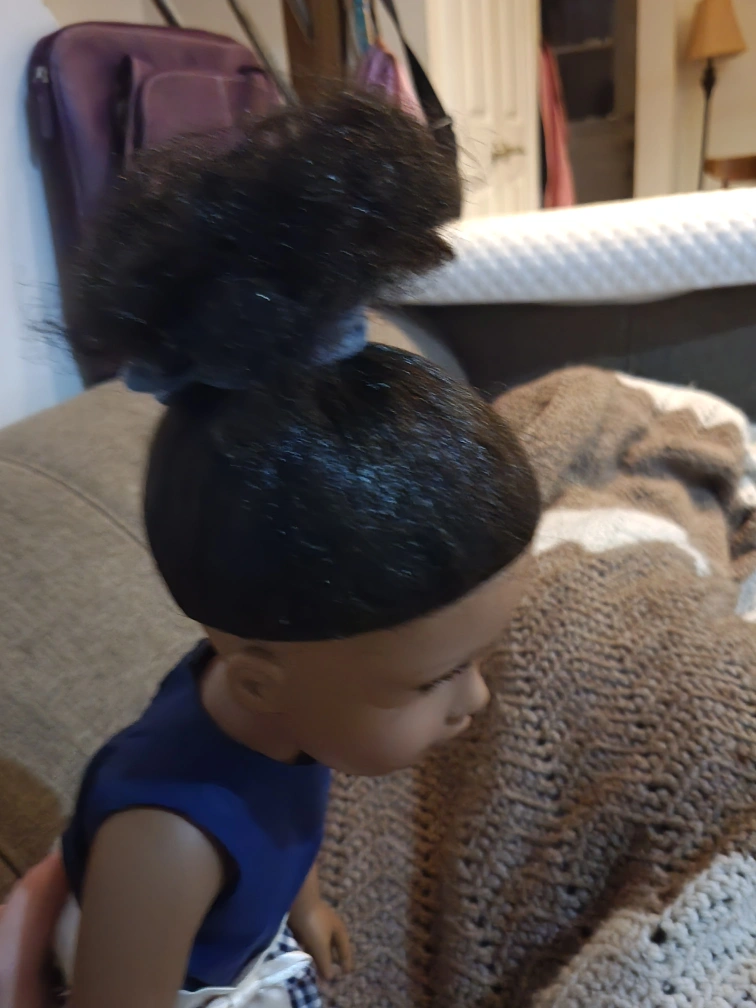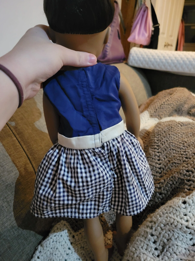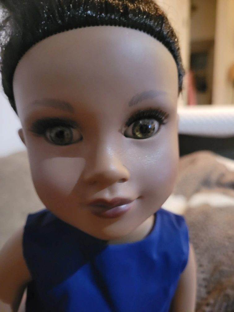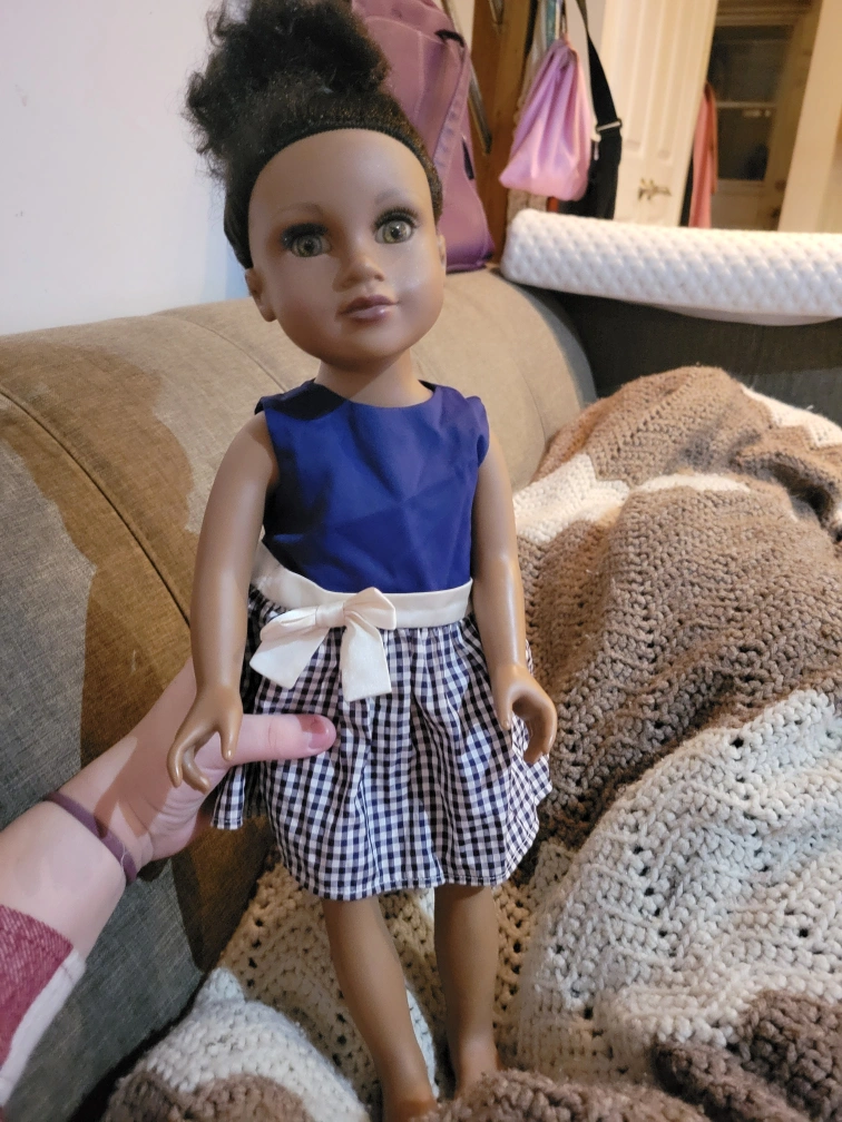 Our Generation Doll with blue dress, black hair, and brown skin. The doll is approximately 18 inches tall. Includes a blue and white gingham dress with a cream coloured sash. bought it for 80 selling for 60