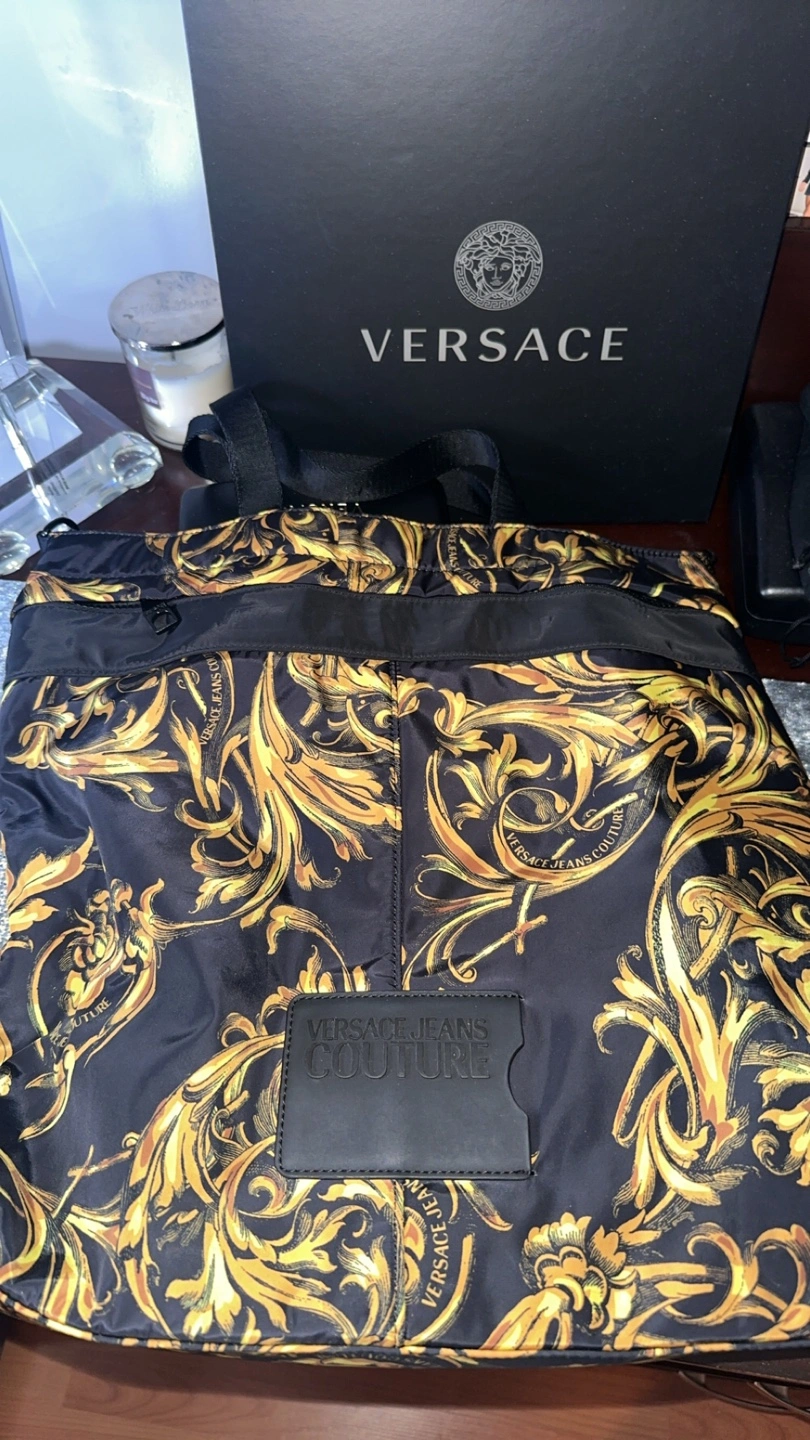 Black tote bag with gold pattern. Interior has one zippered pocket. adjustable shoulder strap. Bag is preowned and in good condition.