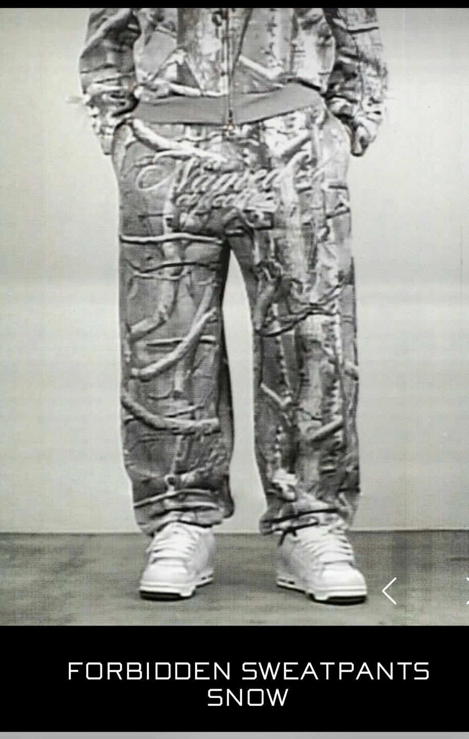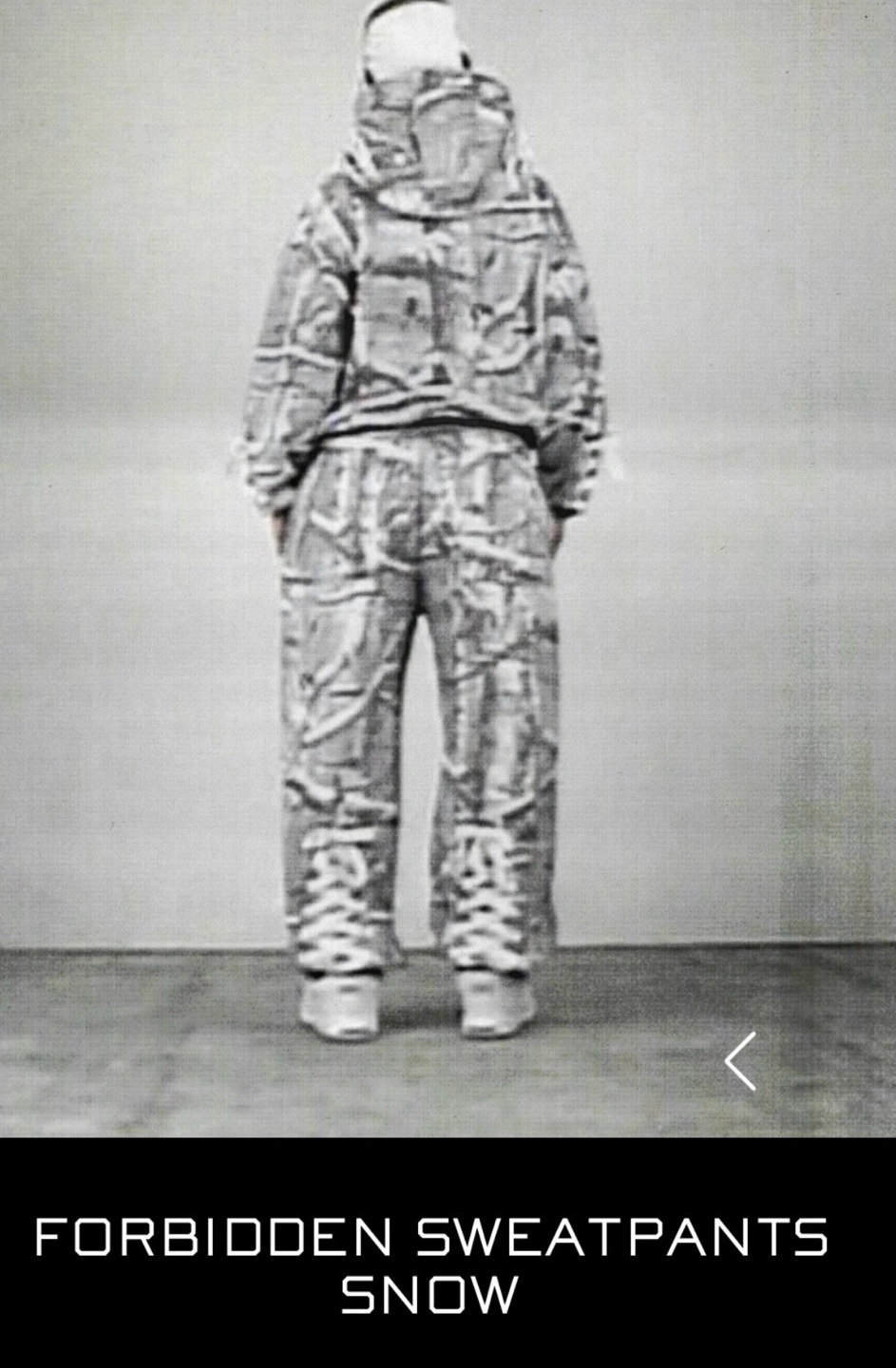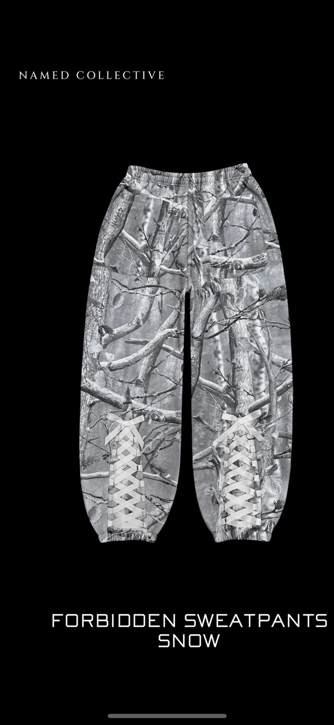 Sweatpants with a camouflage print. They have a white lace detail on the ankles.