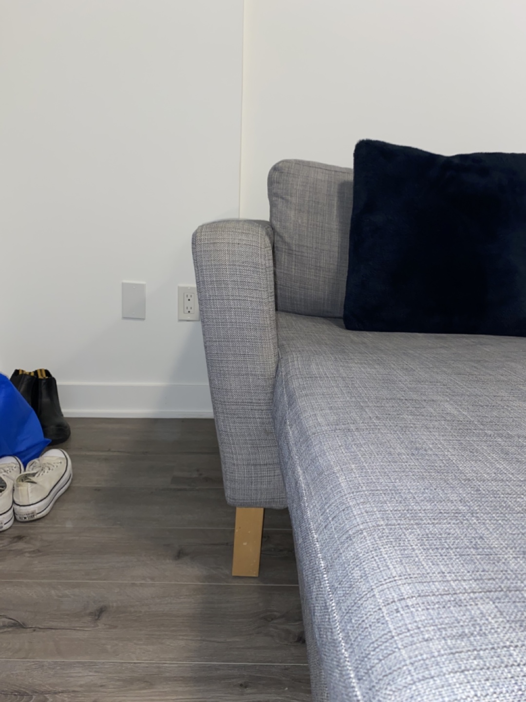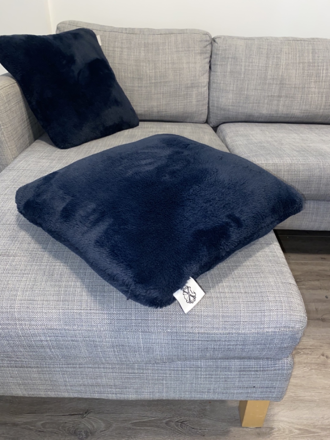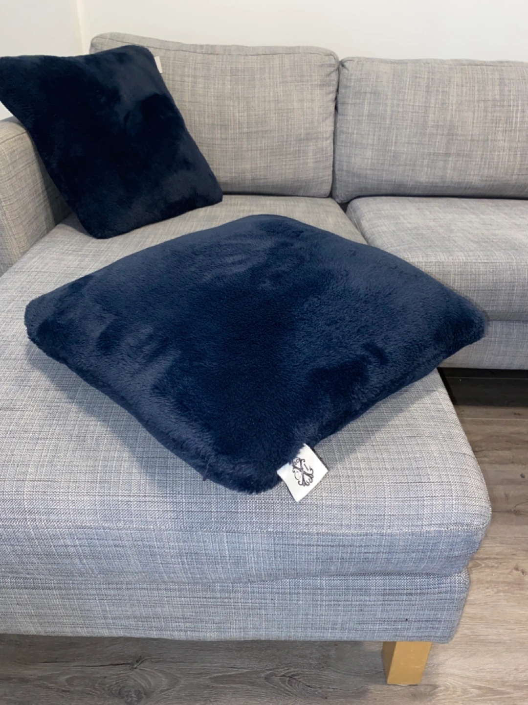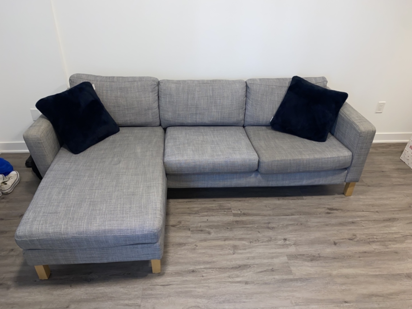 Grey sectional sofa with wooden legs. Includes two throw pillows
