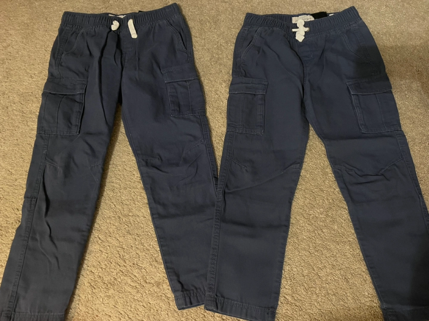 Two pairs of boys' navy cargo pants with elastic waistbands and drawstring closures. Size small (6). Selling both for $20 or $10 each