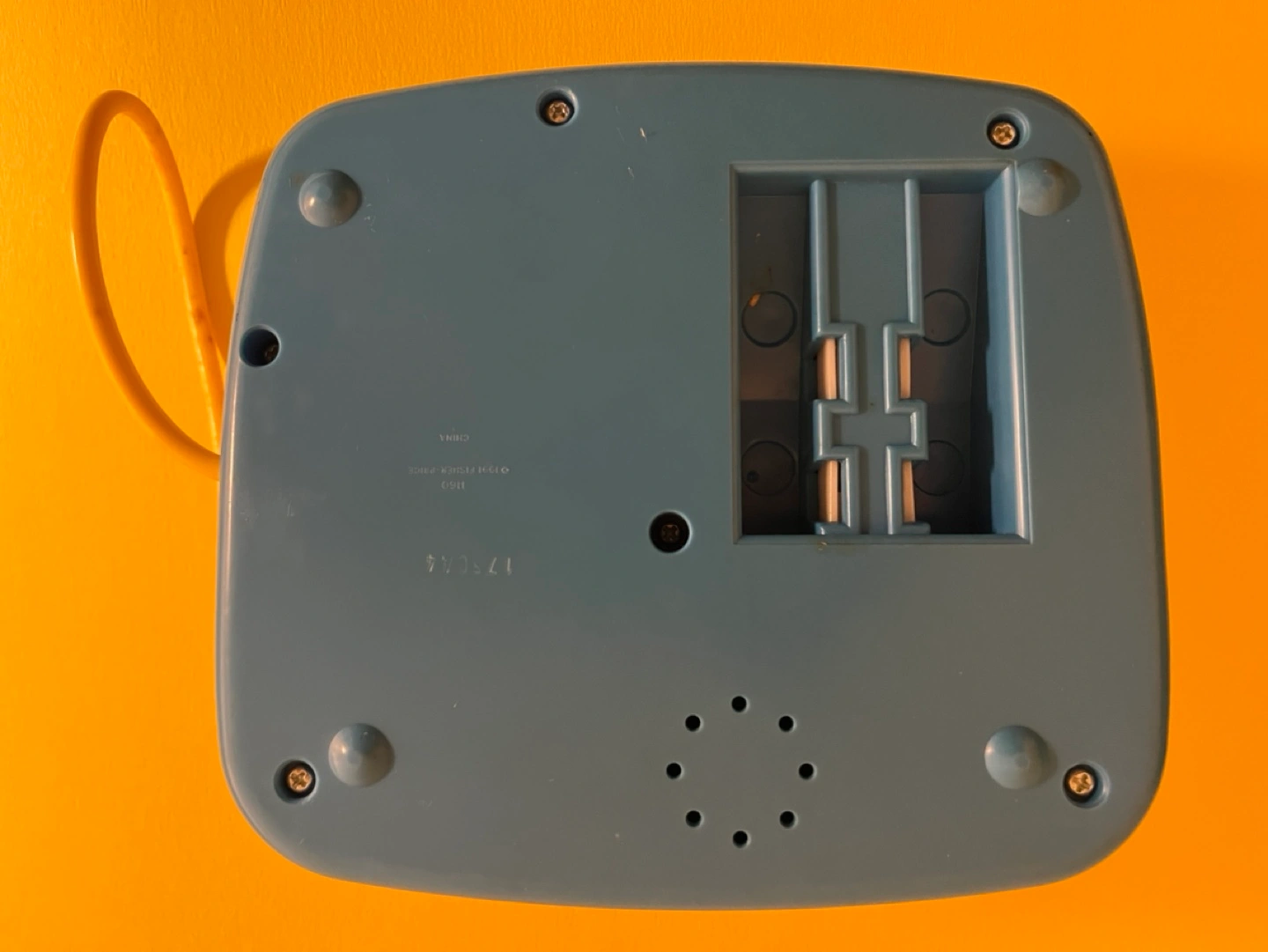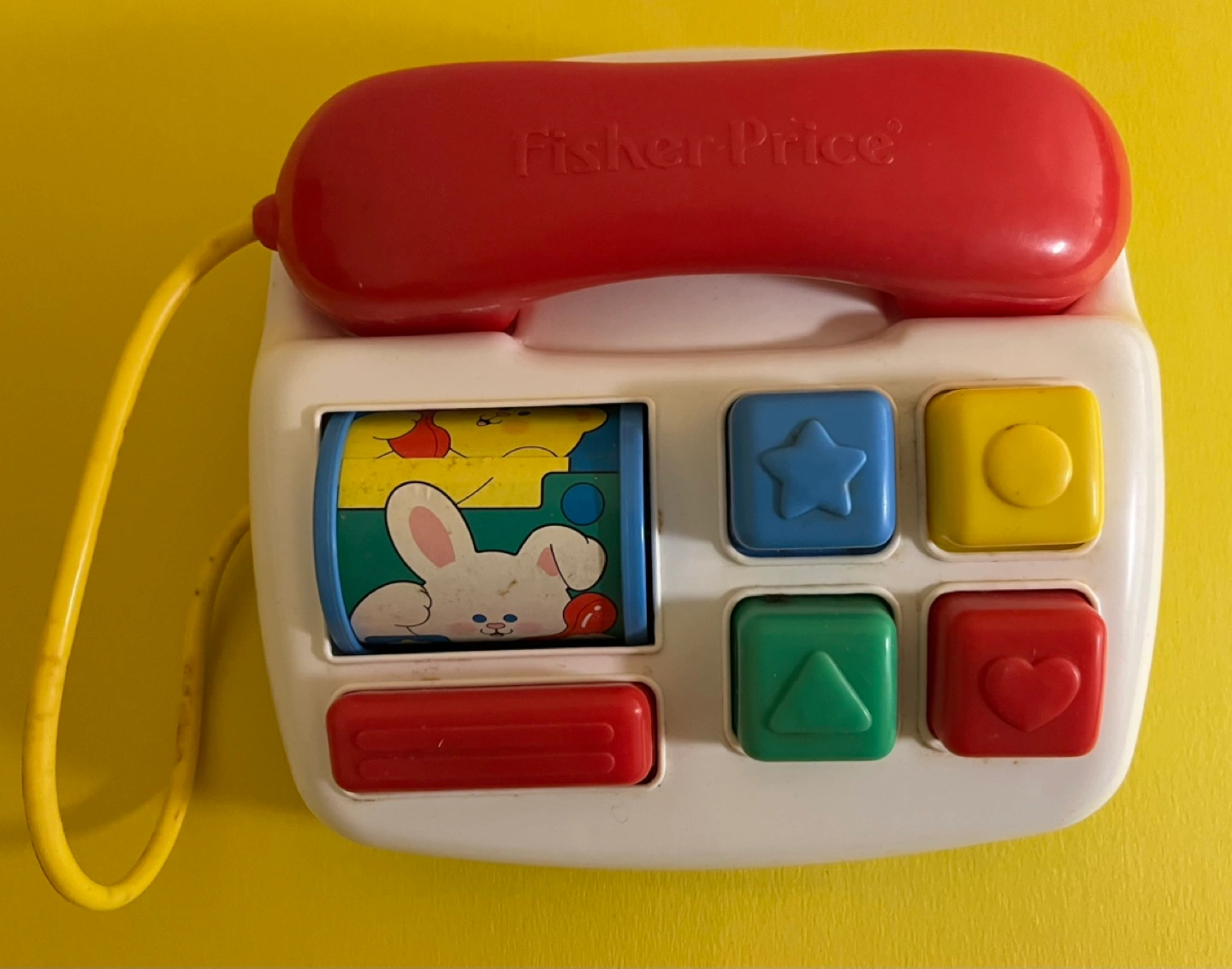 Toy phone with buttons that will ring a bell or spin a roller when pressed. No batteries needed.