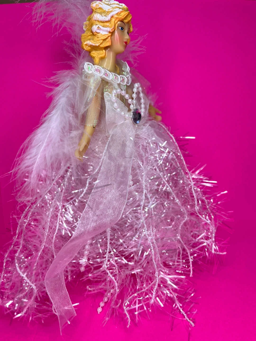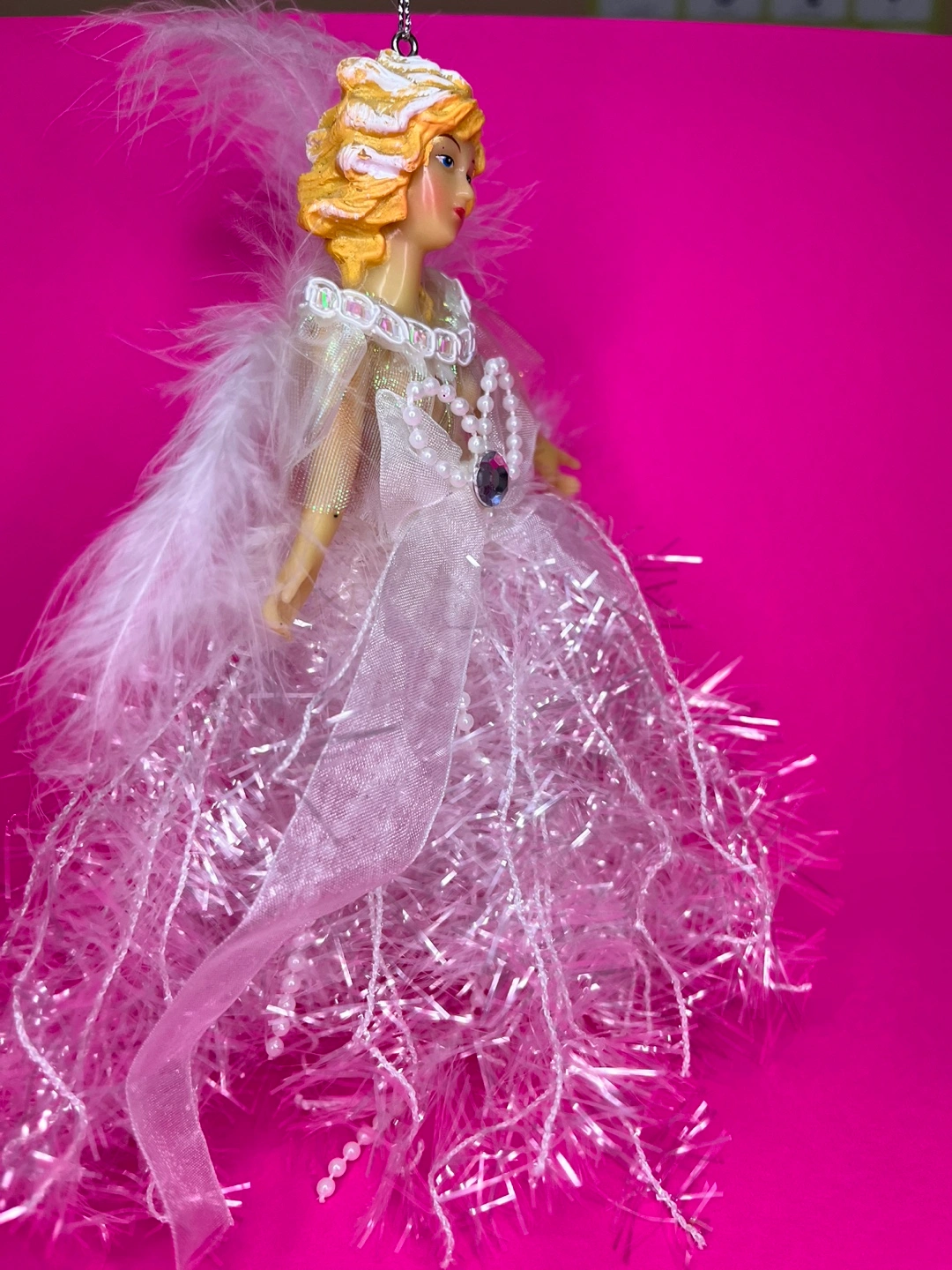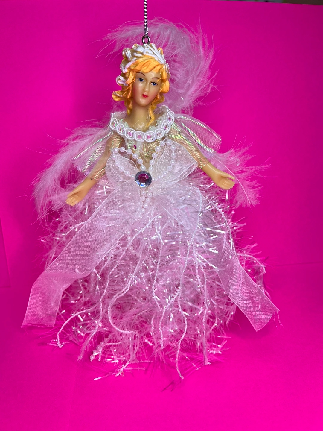 Each angel has a white dress with sparkly tinsel, a pearl necklace, a white feather and a jeweled bow. They are approximately 8 inches tall.