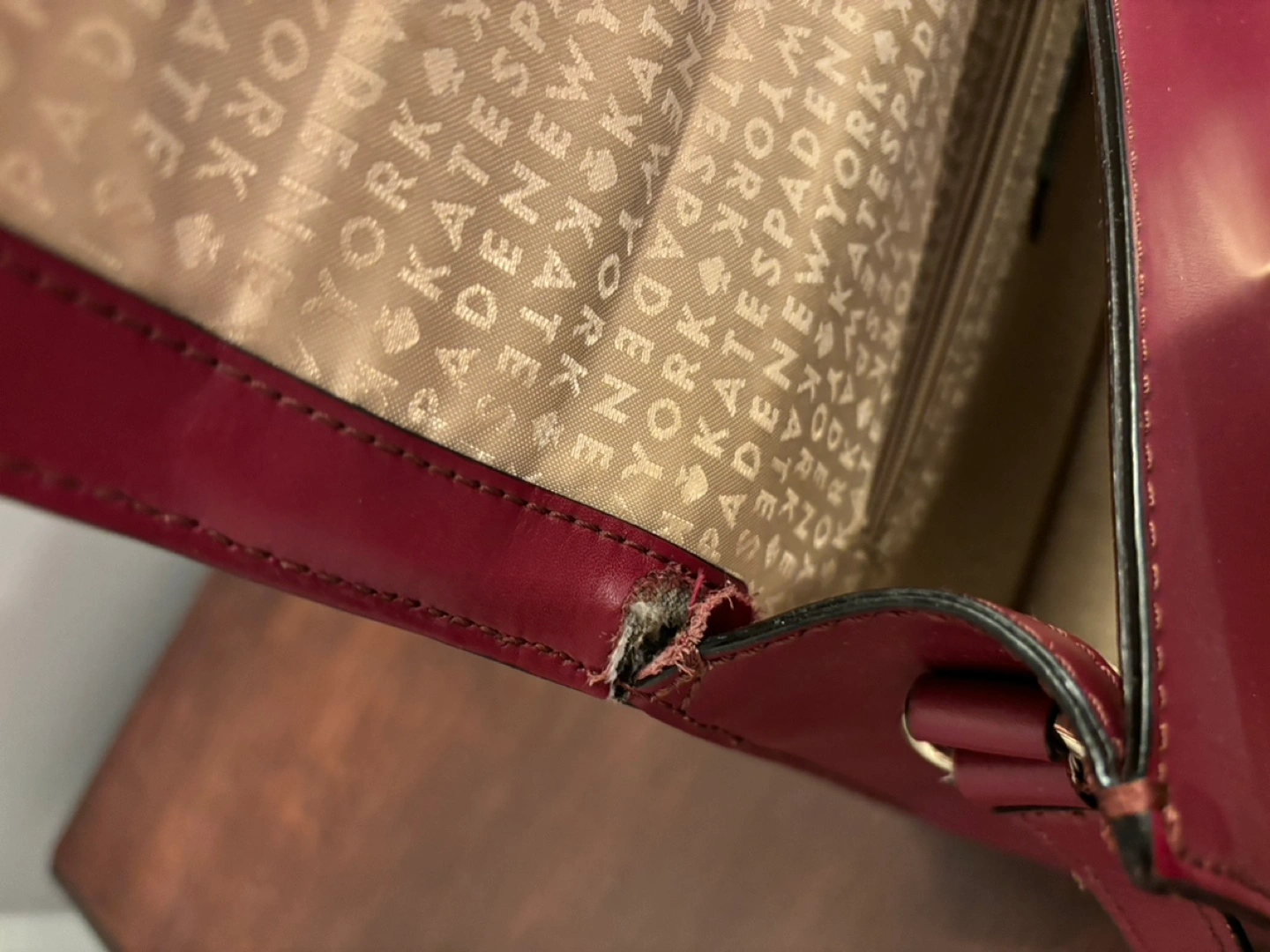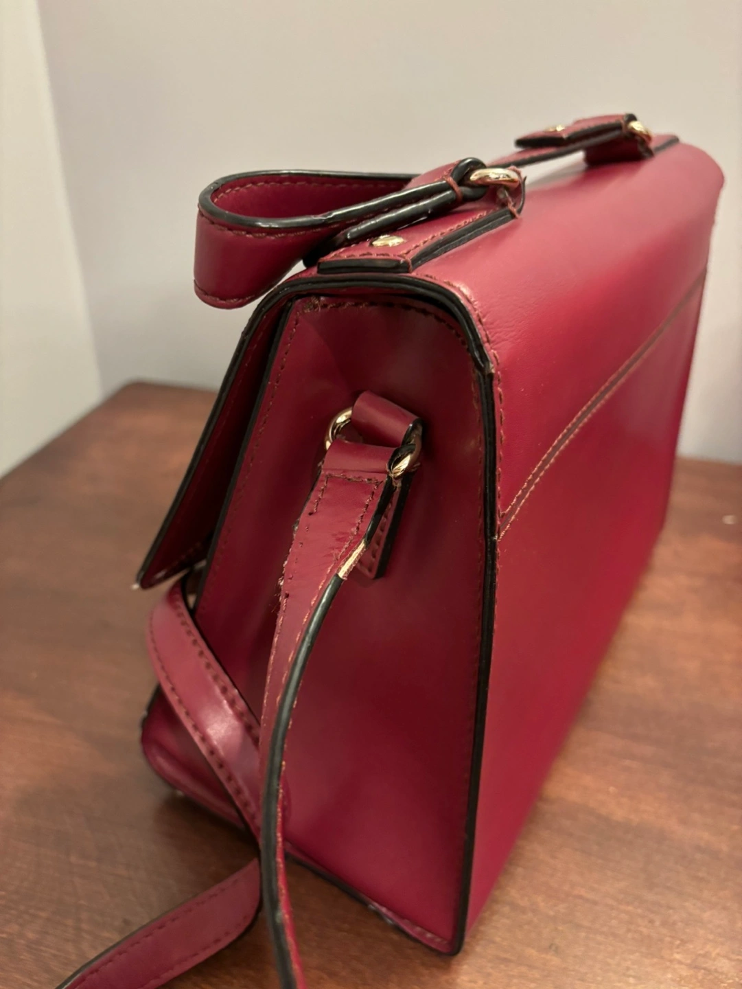 Burgundy leather crossbody bag with a gold chain and clasp. The bag has a small tear on one of the corners, but otherwise in good condition.