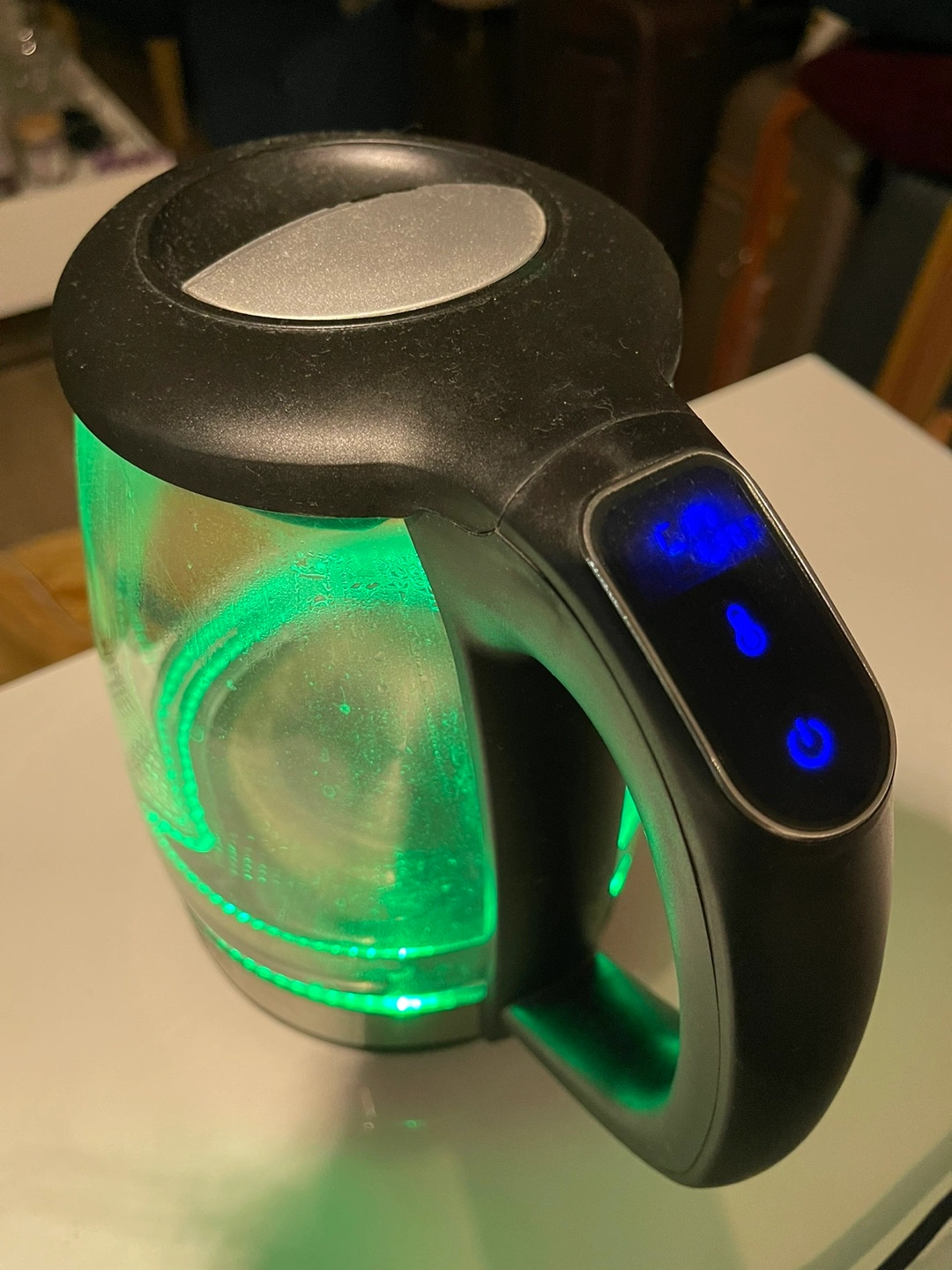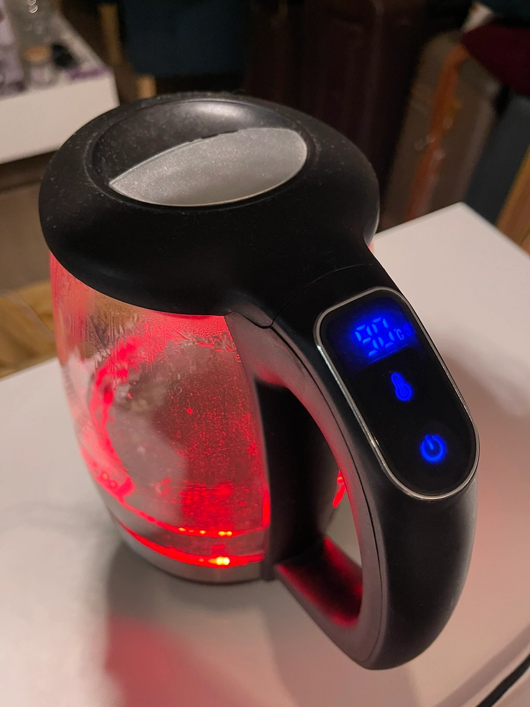 Glass electric kettle with LED lights. Features a digital display to show the water temperature. And changes colour at 50, 60, 70, 80 and 90 C.