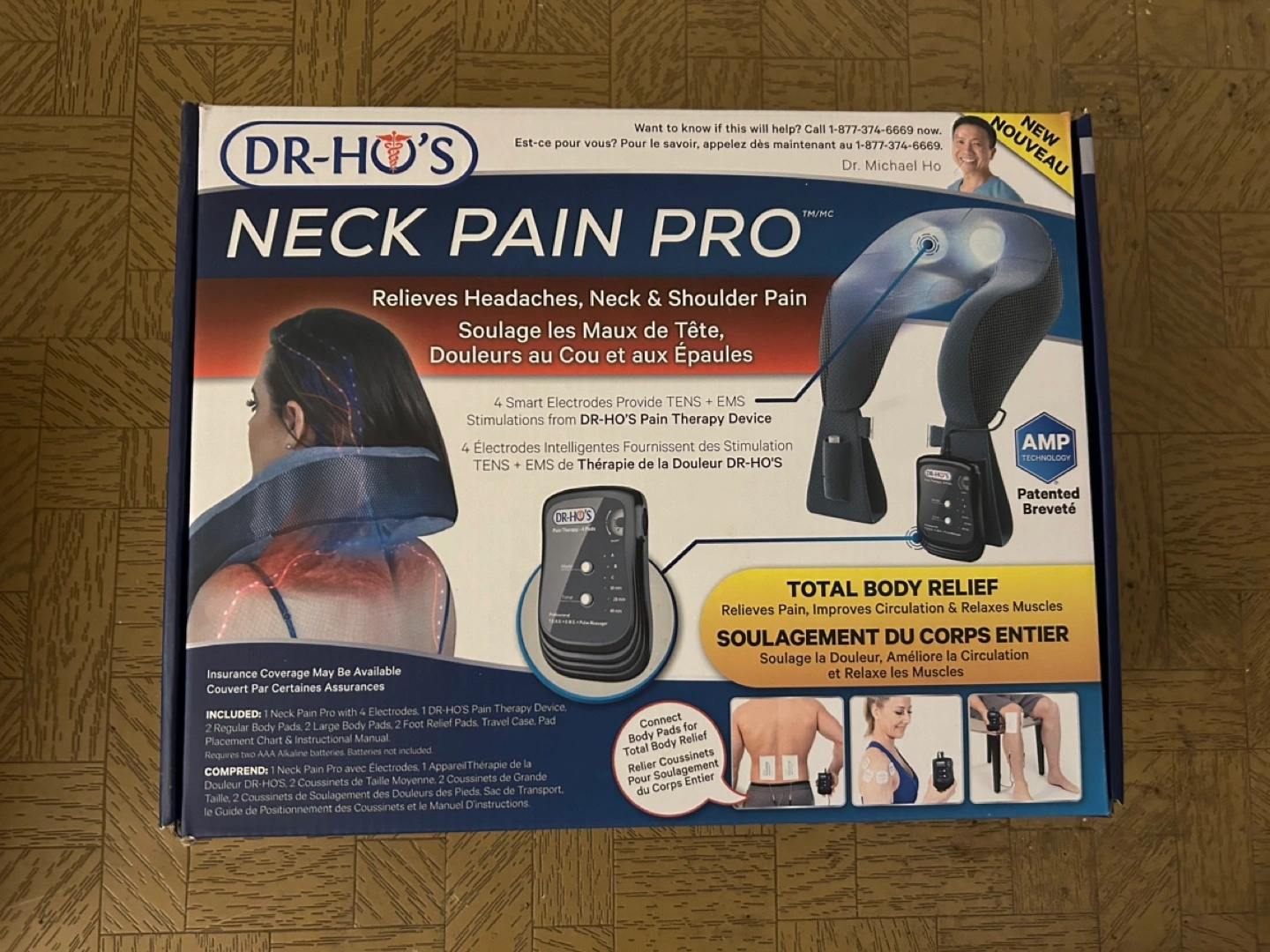 Neck and shoulder pain relief device, comes with 4 electrodes and 2 different sizes of pads. Features TENS + EMS technology. Never used only been open