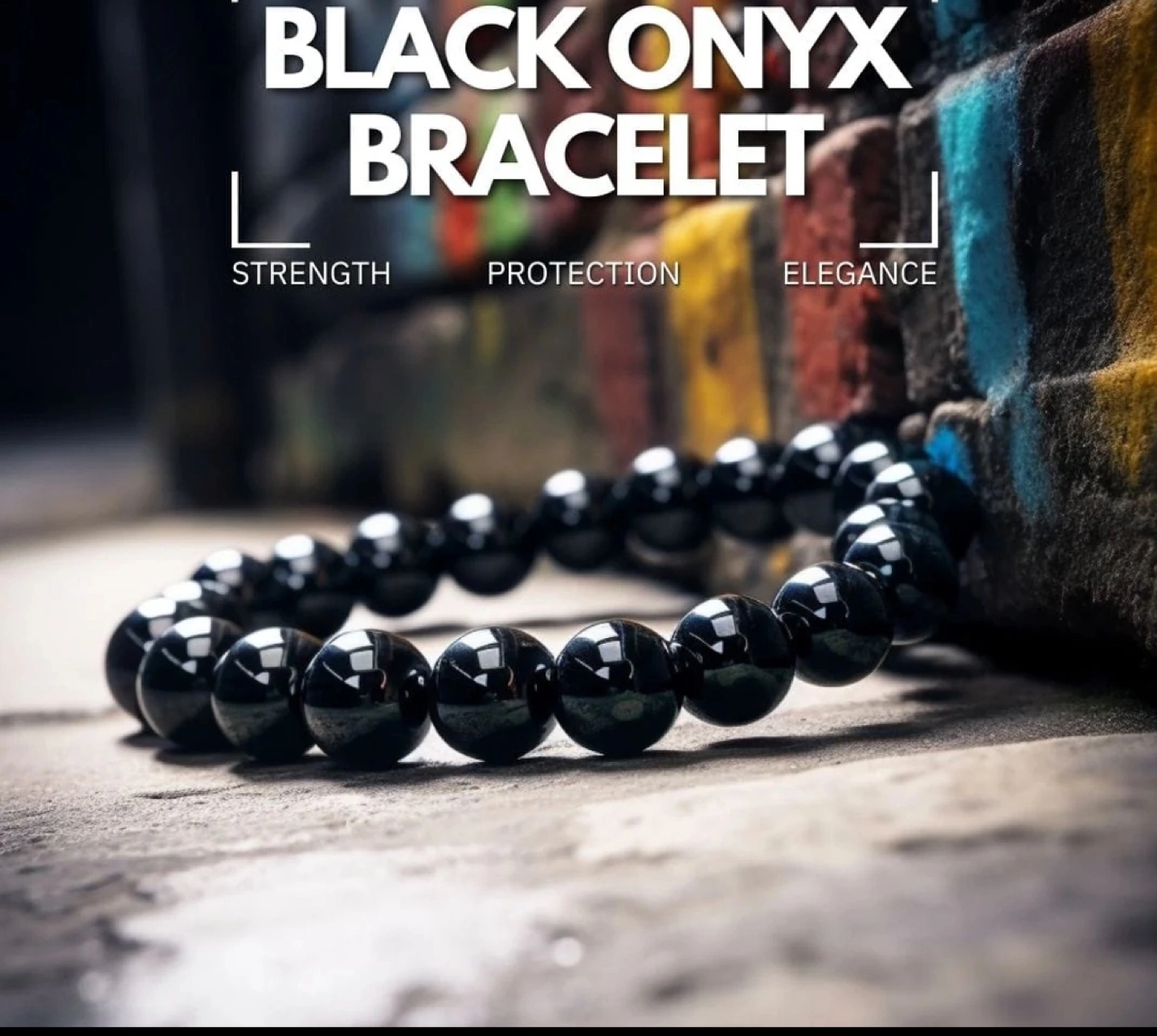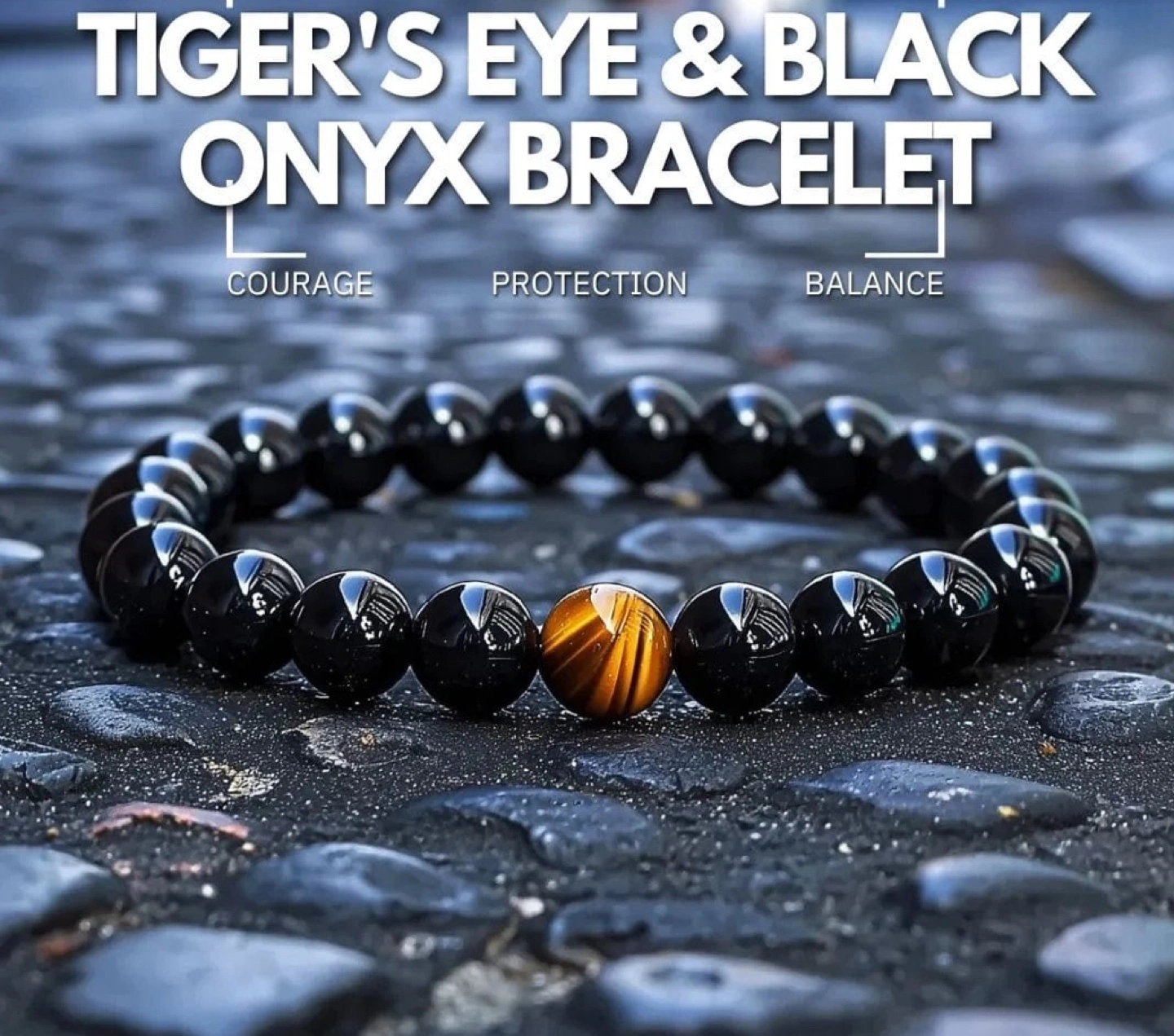 Black Onyx bracelet with a Tiger's Eye bead. Features a stretchy band.