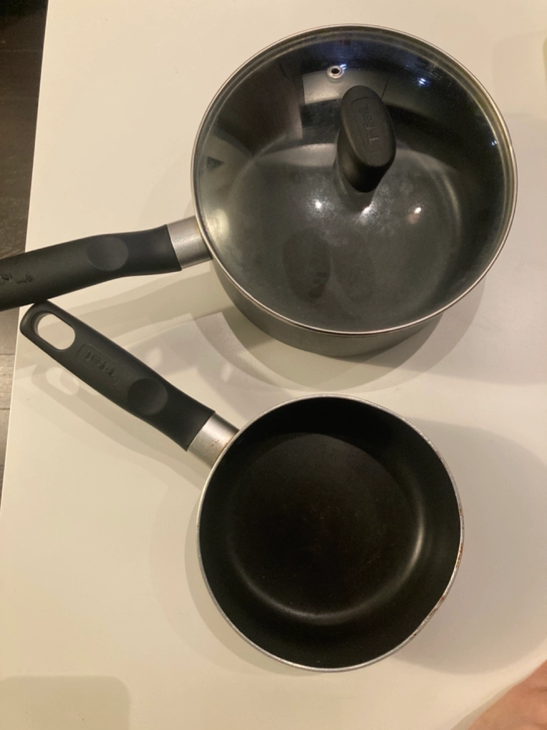 Two T-fal saucepans, one with a lid. Both have black interiors.
