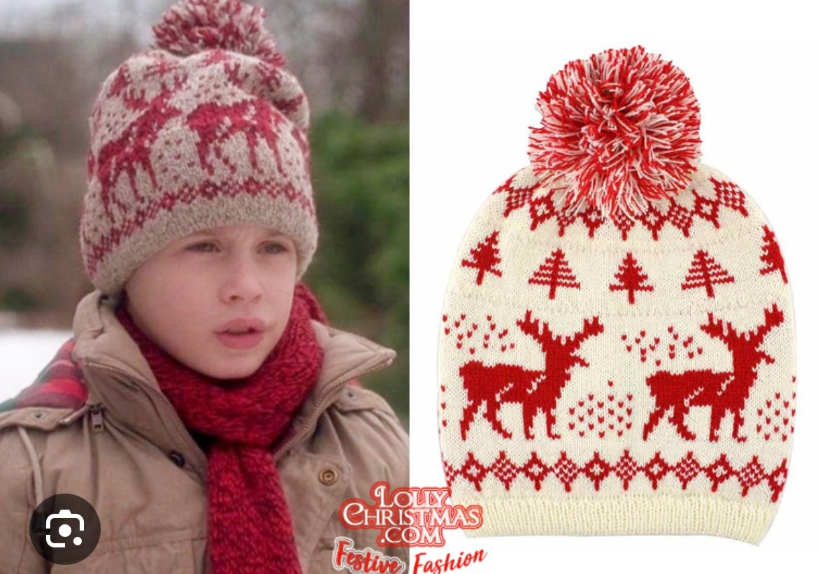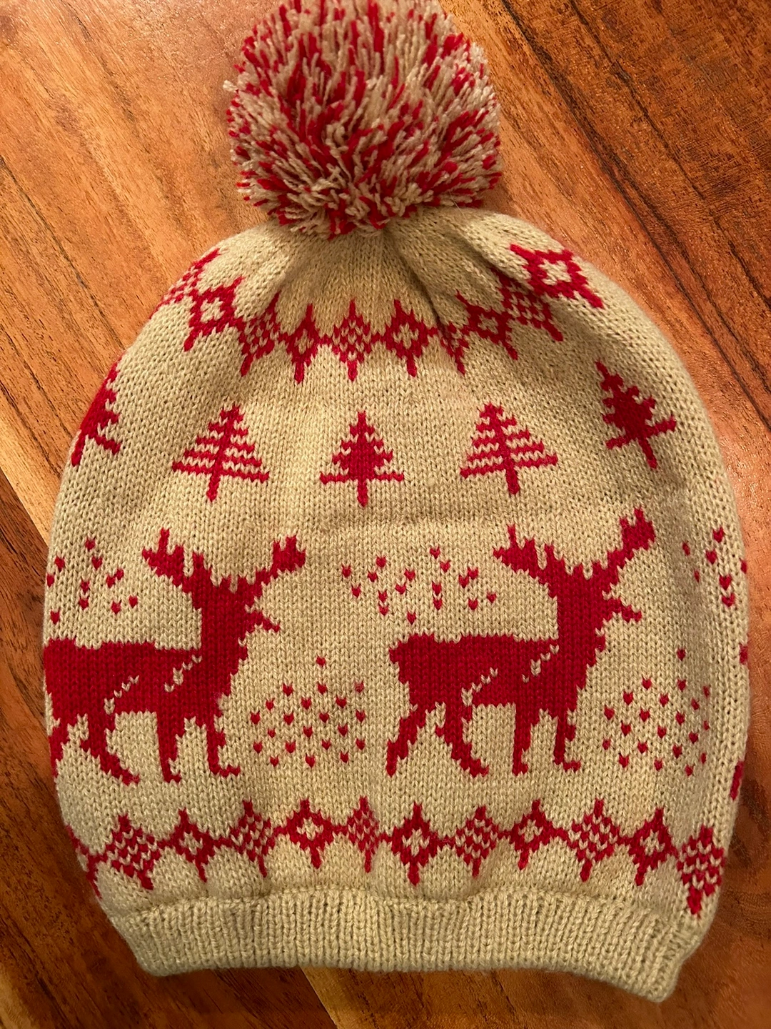 395HOME ALONE Knitted beanie with a pompom. Features a reindeer pattern with red accents.