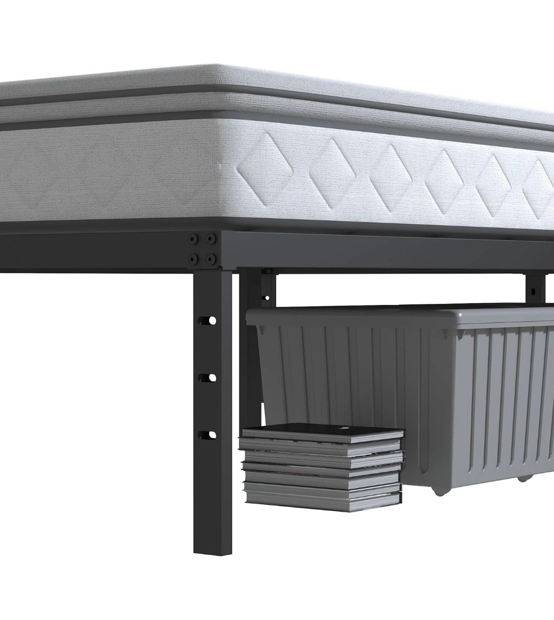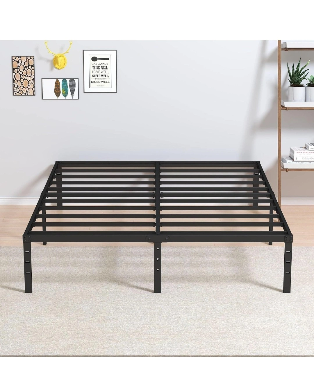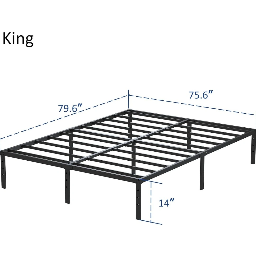 King size metal bed frame. Metal slats for mattress support. No box spring required. 14 inches high. Easy assembly.