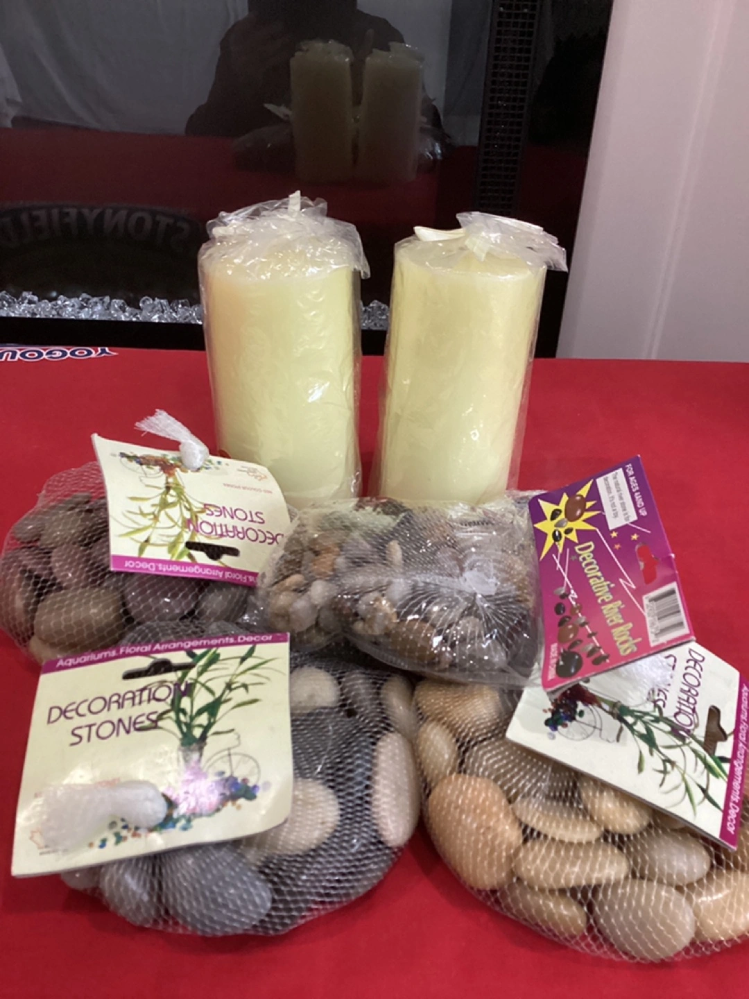 Five bags of river decorative stones two different kind and Two candles brand new I bought it for decoration and never used it