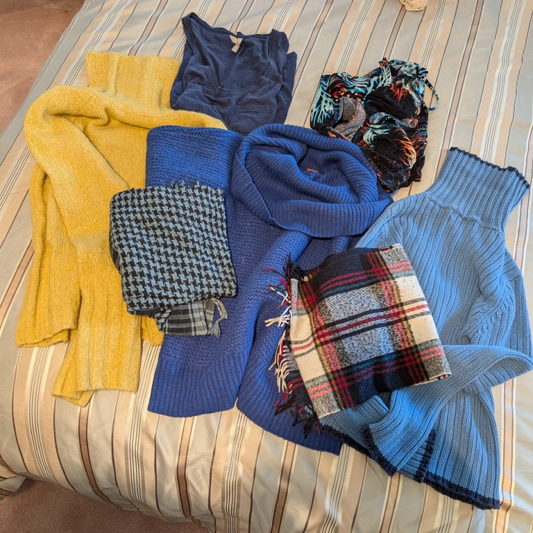 3 knit sweaters, a tank top and a sleeveless patterned top with a couple of scarves.