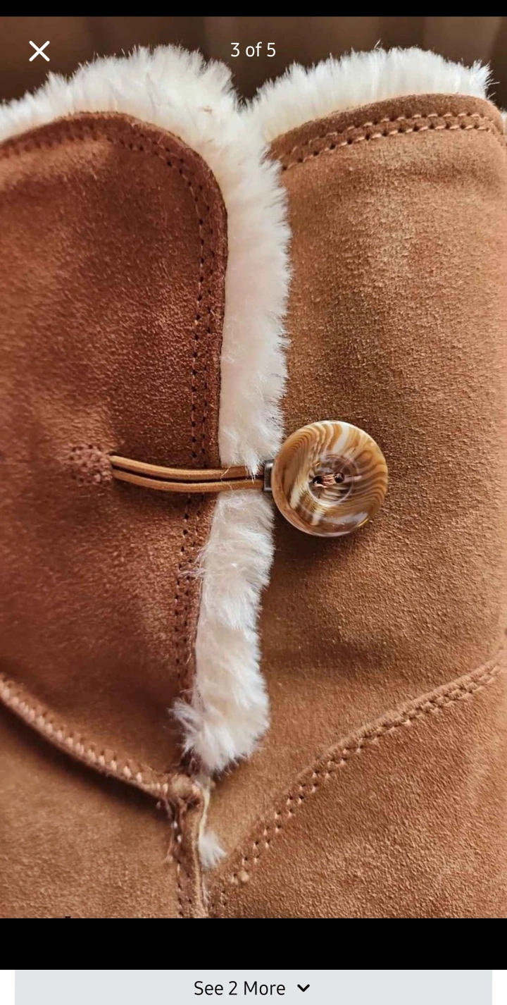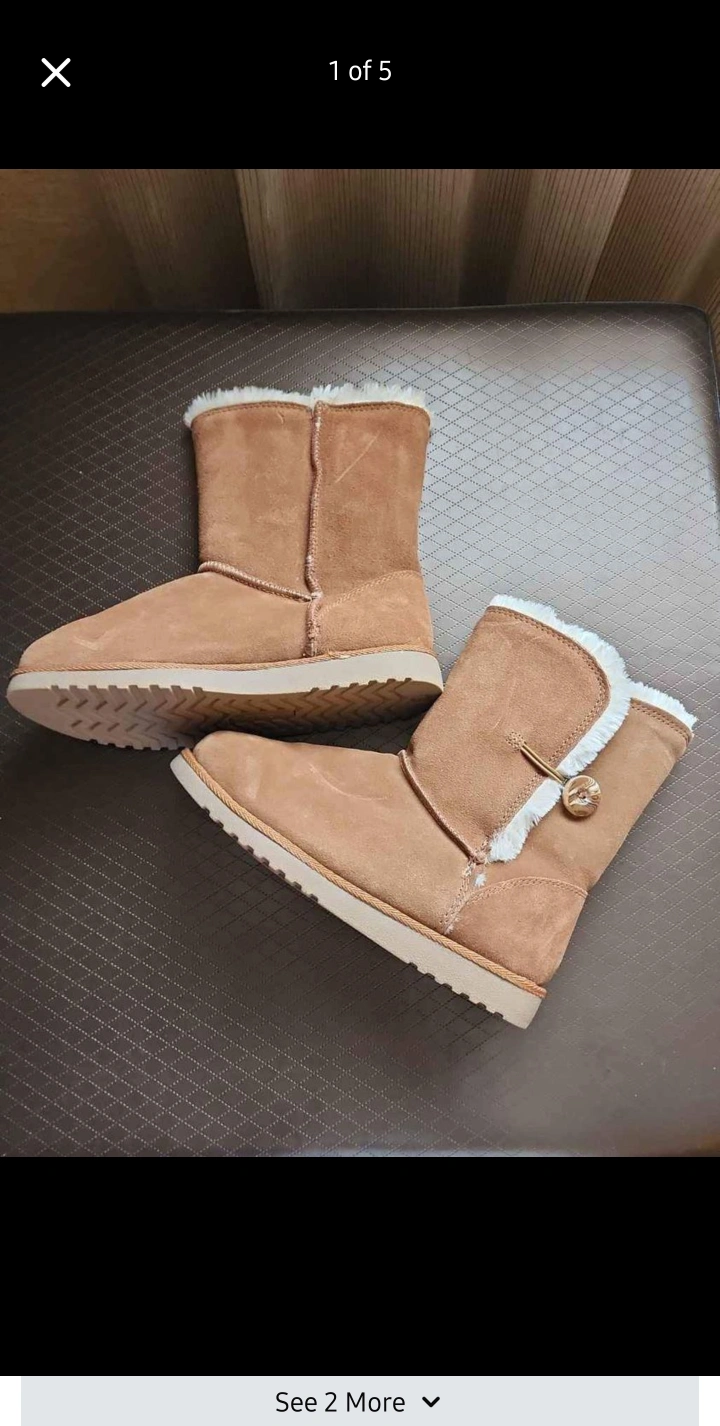 22Brown suede boots with a faux fur lining. Button closure. Made in China.