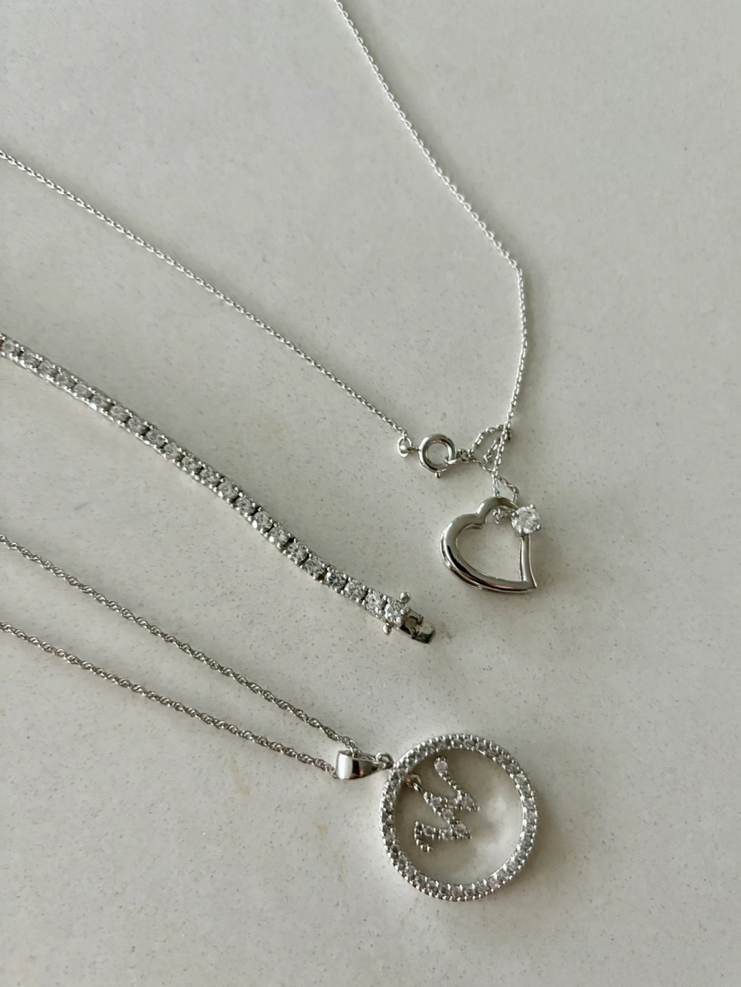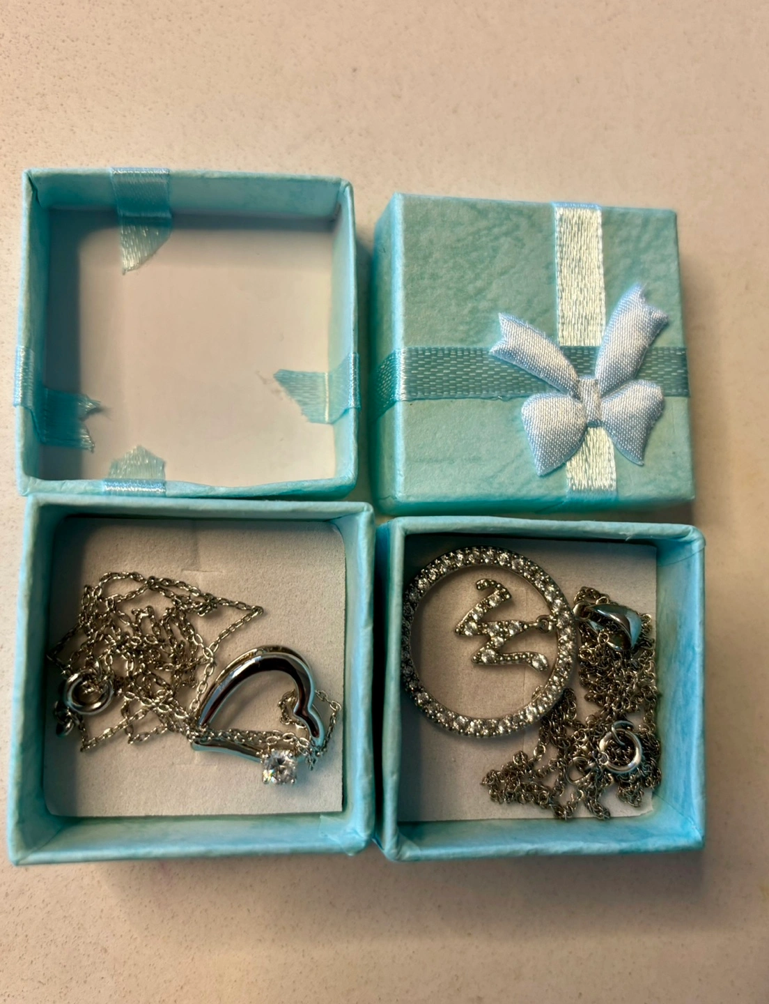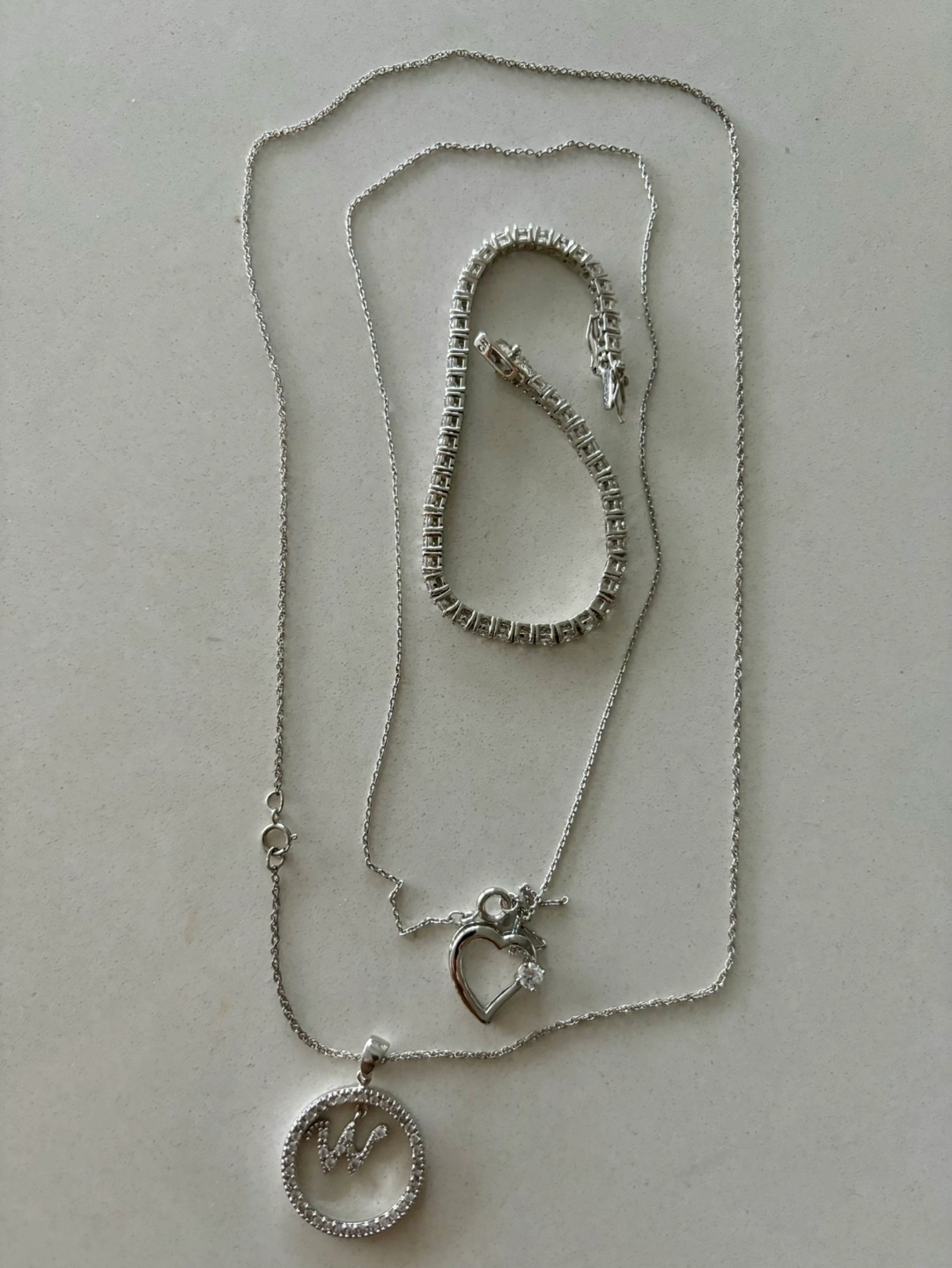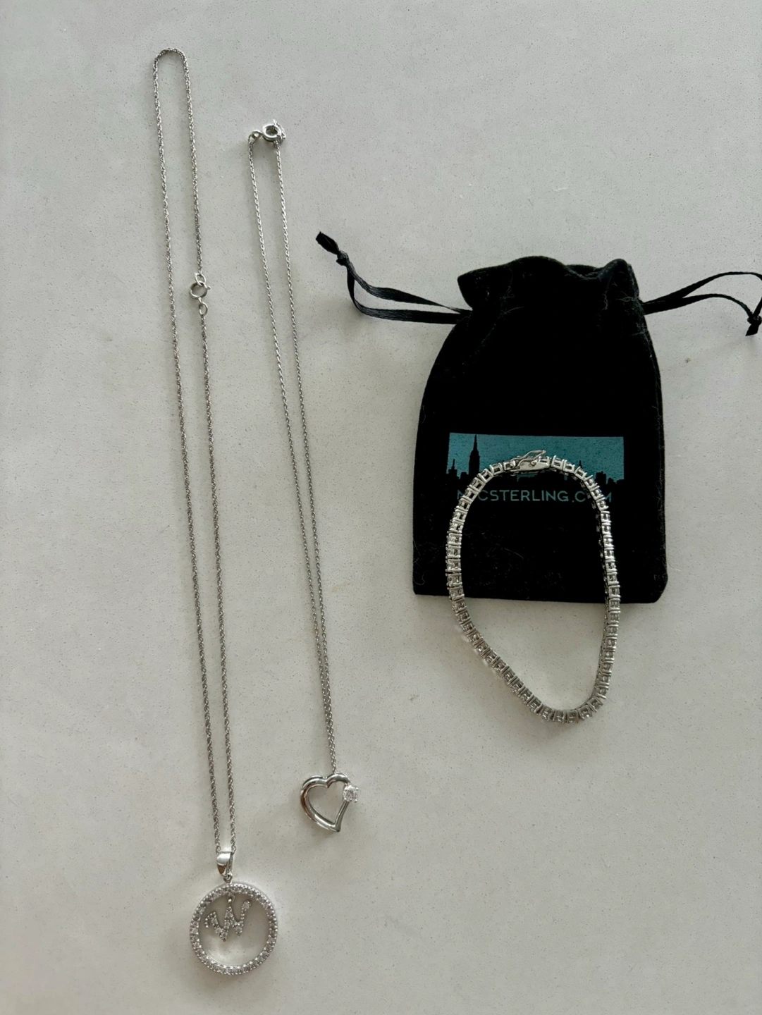 1000+Two necklaces and a bracelet. One necklace has a heart pendant with a small CZ diamond and the other a circular pendant with the letter W set with CZ diamonds. The bracelet, brand new, is a tennis bracelet with a line of CZ diamonds. Iβve had the necklaces for years and they are still in great condition and sparkling. The chains of the necklaces are sterling silver I believe. Price is all 3 pcs including two little gift π (see last pic) for the necklaces and a velvet pouch for the bracelet. Or $8 each. Click on my name above to see my other listings and pickup locations.