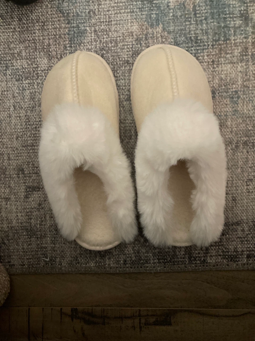 These slippers are very warm with a nonslip thick sole. They are faux suede in a cream colour with white faux fur trim.