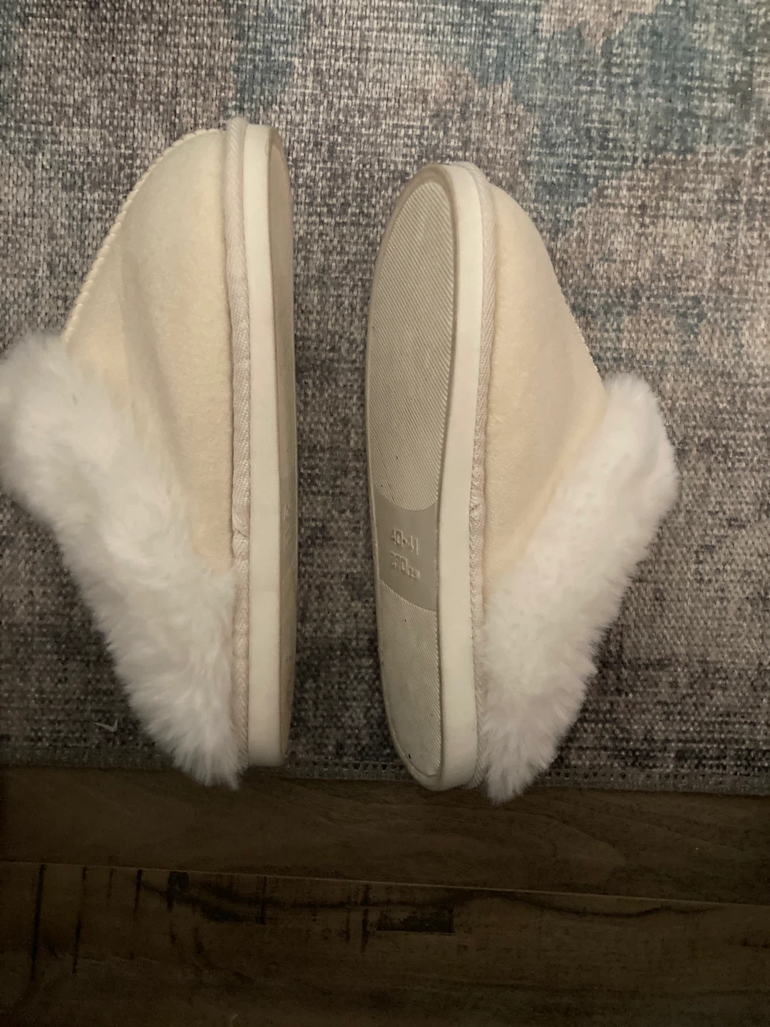 These slippers are very warm with a nonslip thick sole. They are faux suede in a cream colour with white faux fur trim.