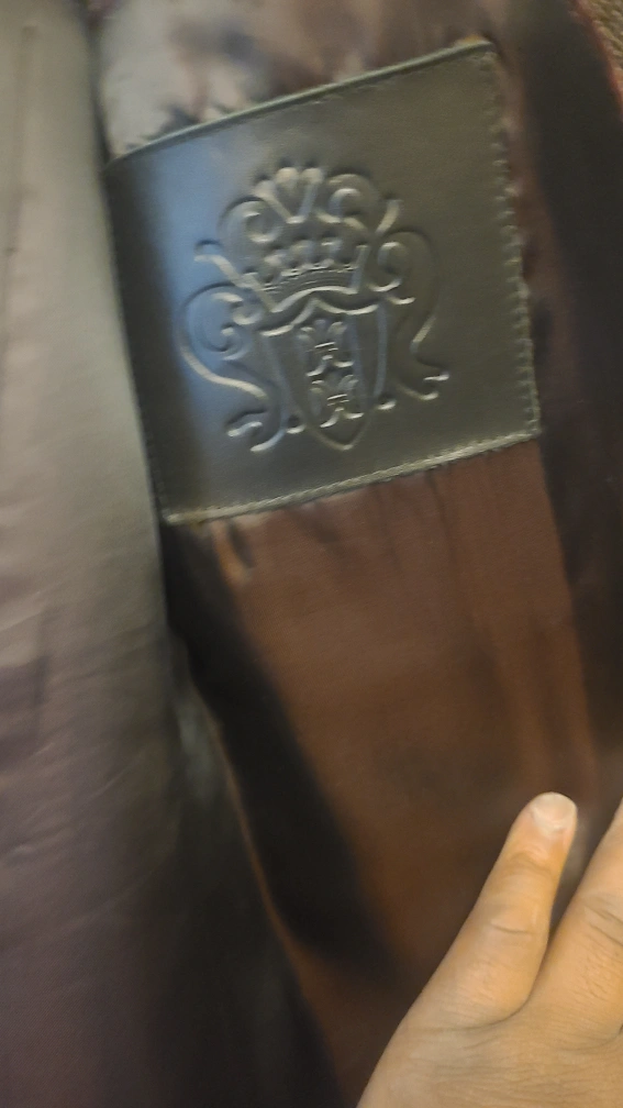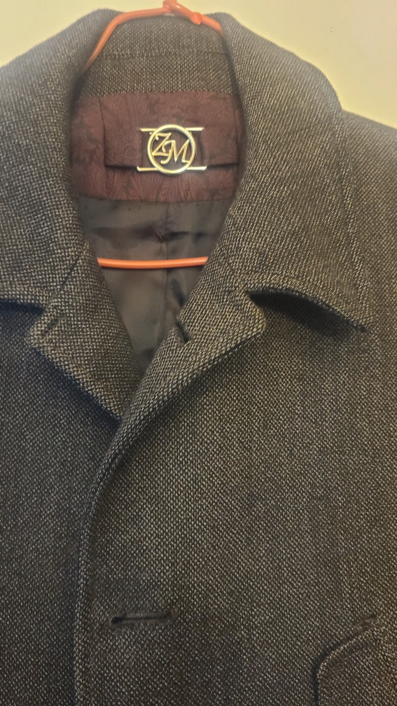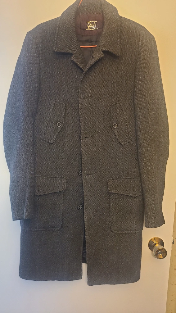 10Men's winter coat with a herringbone pattern and two large pockets. The coat has a button closure and a collar.