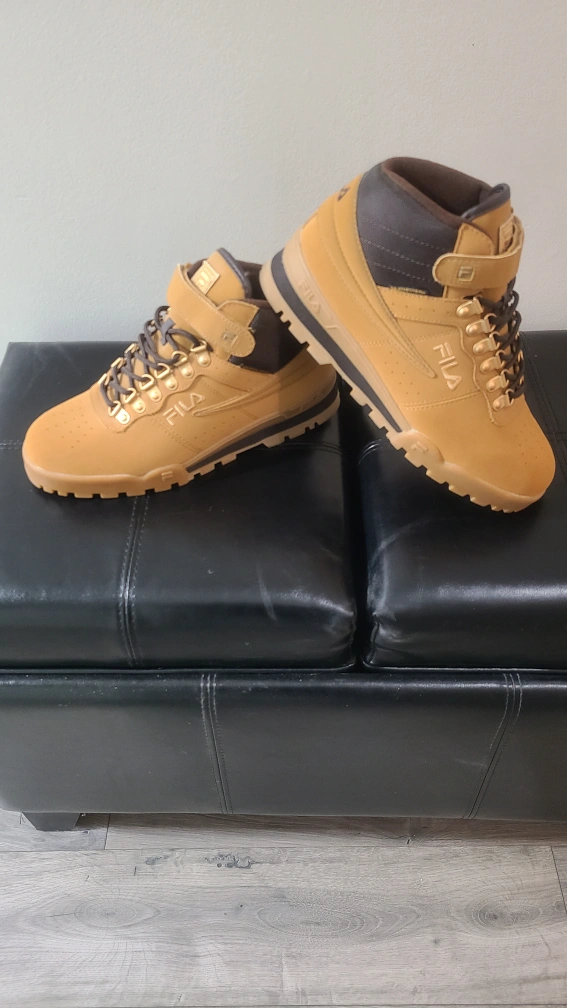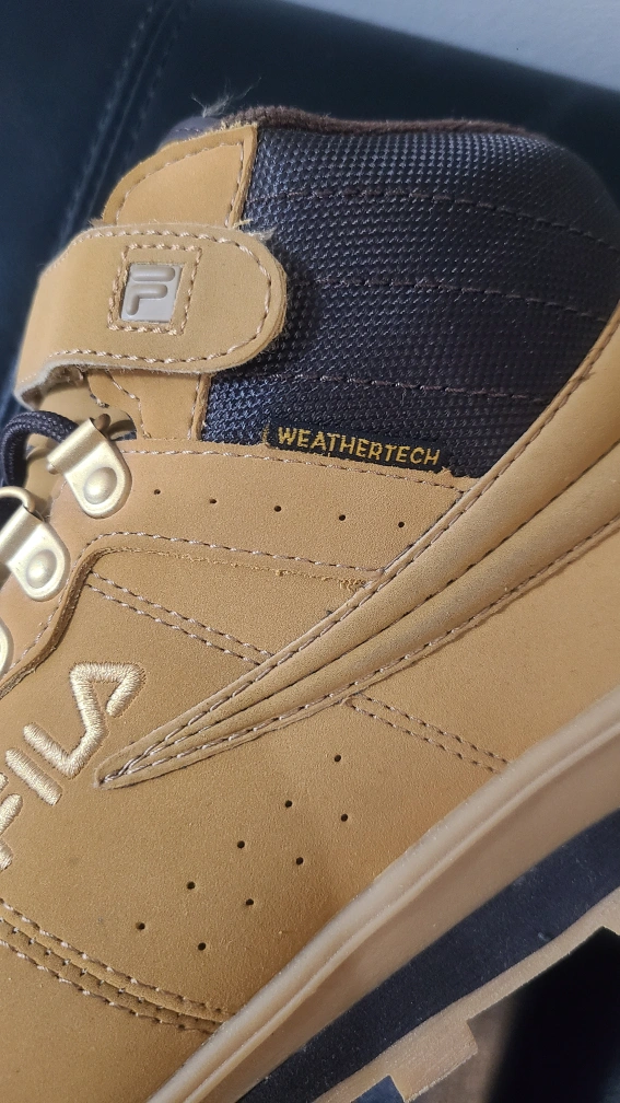 10Tan and brown hiking boots with laces and a strap. Weathertech.