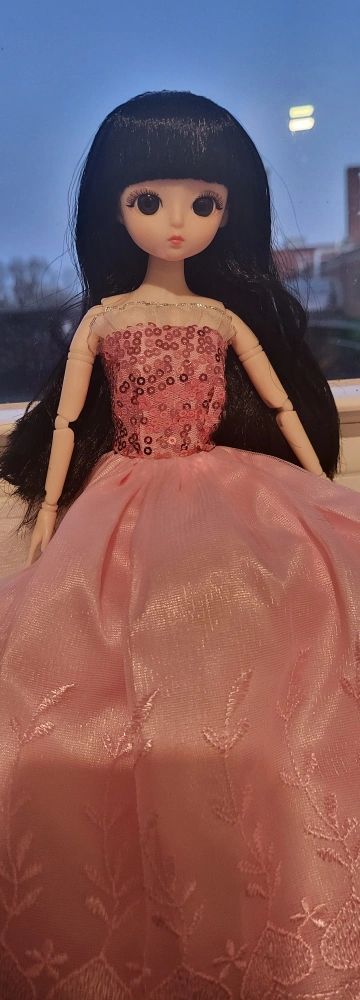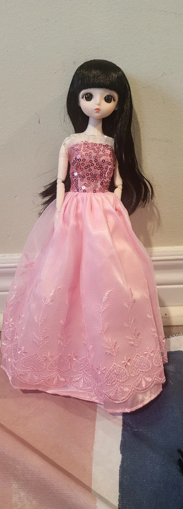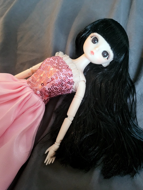 ANIME DOLL + SEQUINS PINK DRESS - HAS GLASS EYES & BLACK HAIR