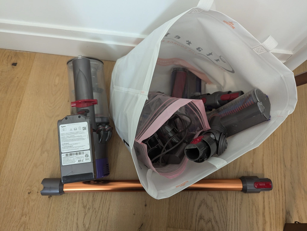 Dyson V11 + all attachments, including a charging base, extension wand, and cleaning heads. In good condition.