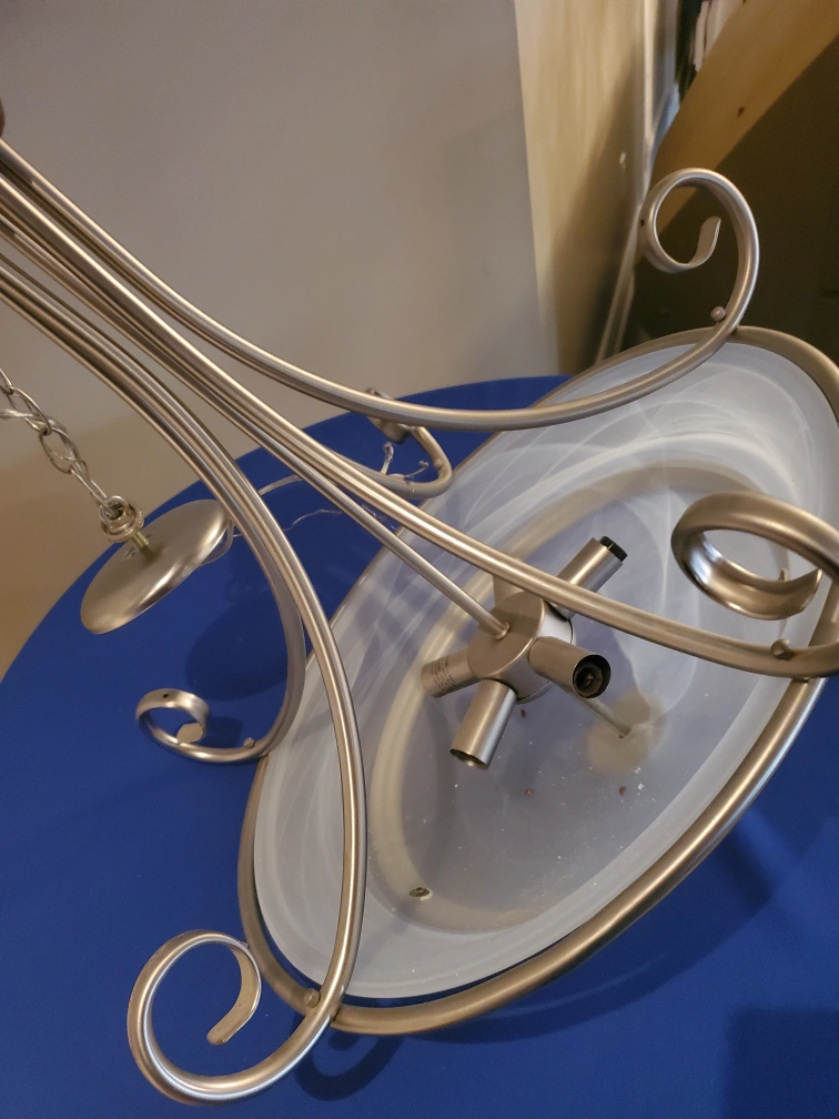 Chandelier with frosted glass shade. Stainless steel frame with adjustable chain for hanging. Excellent condition. Good for any room.