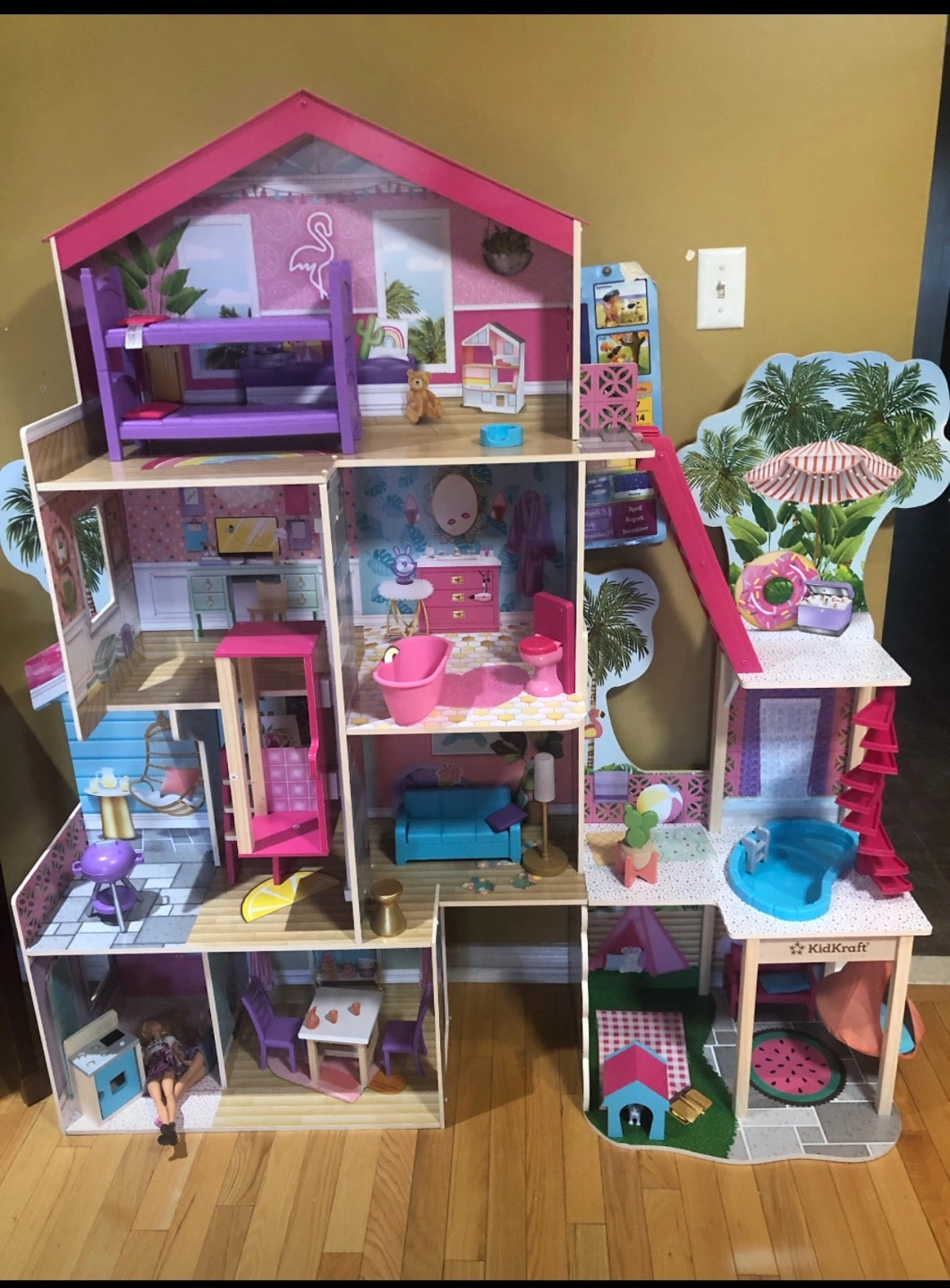 1000+Multi-level dollhouse with various rooms, furniture, and accessories. Includes a swimming pool, a patio area, and a bunk bed. (I have box available ) pet free and smoke free - used by 8-9 year old girl so it is pretty clean and good ππ» . Costco discounted price $250 plus tax