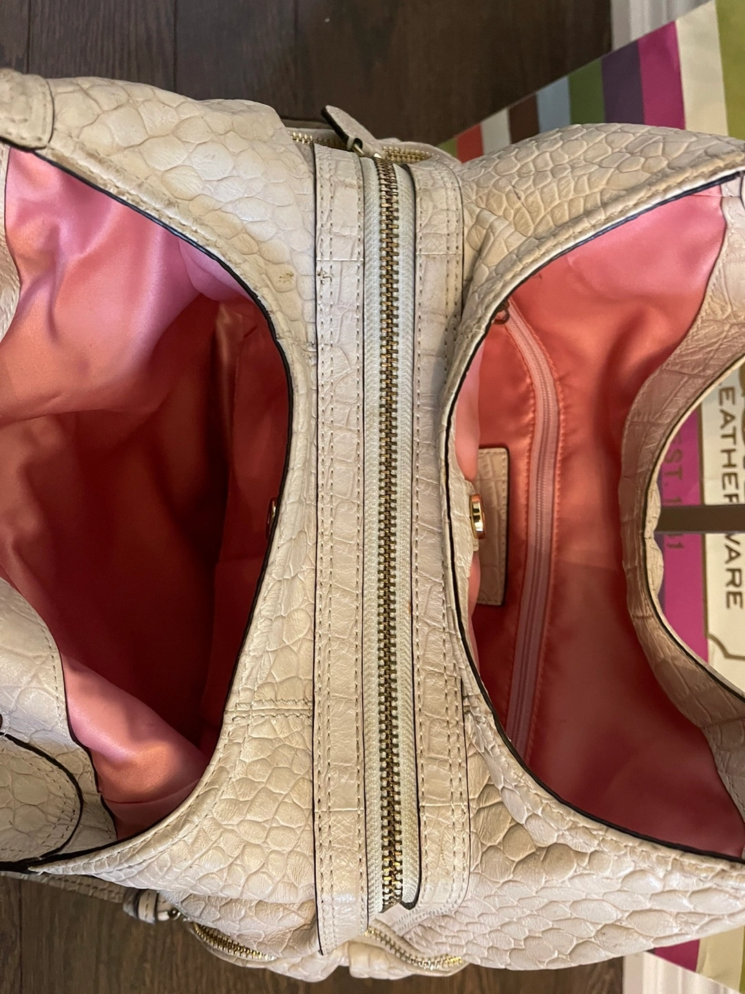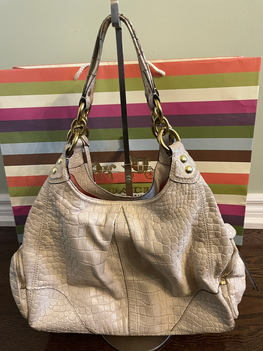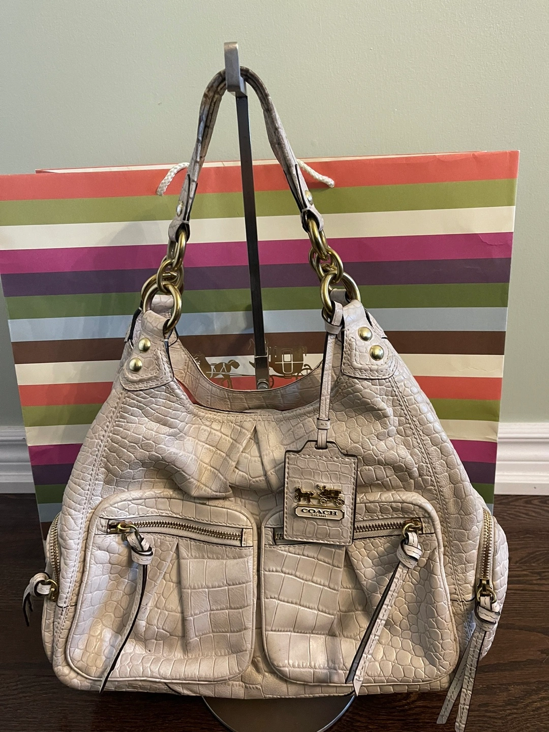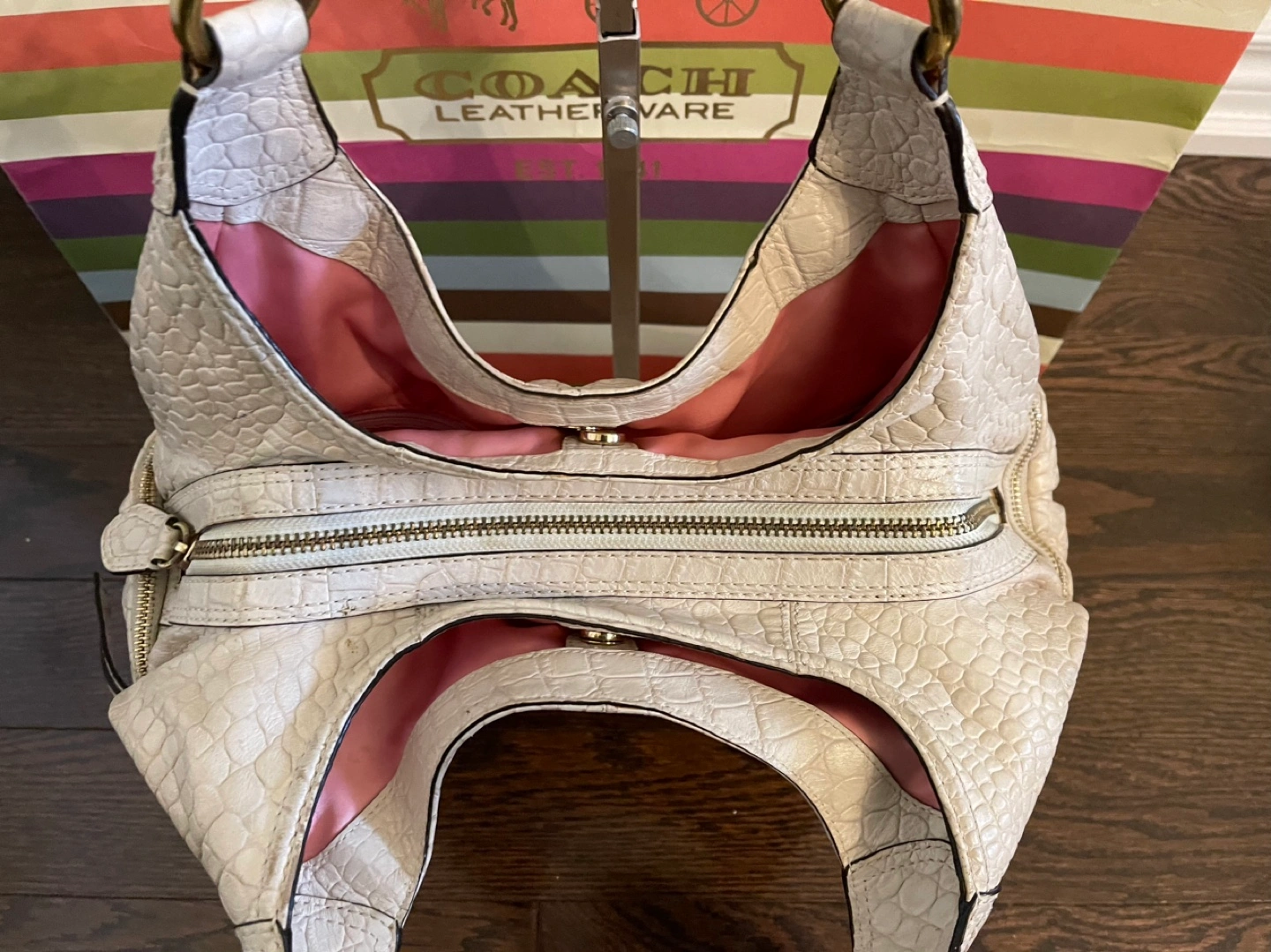 Coach original shoulder bag in ivory color and beautiful pink silk lining. Lots of space, very roomy. The bag has been loved but has lots of life left. Retailed for 698+ tax Only selling for $60 Pick up near Bathurst and Steeles in Thornhill