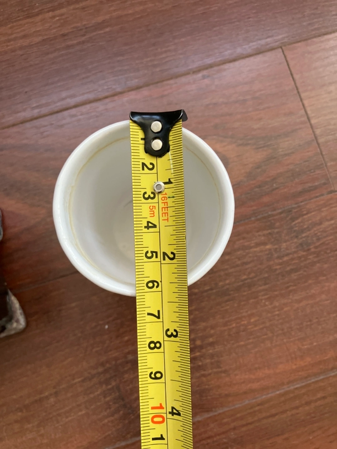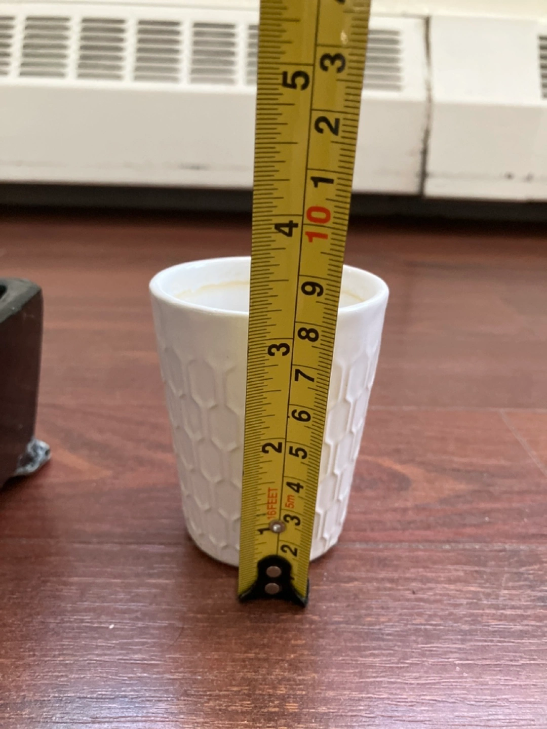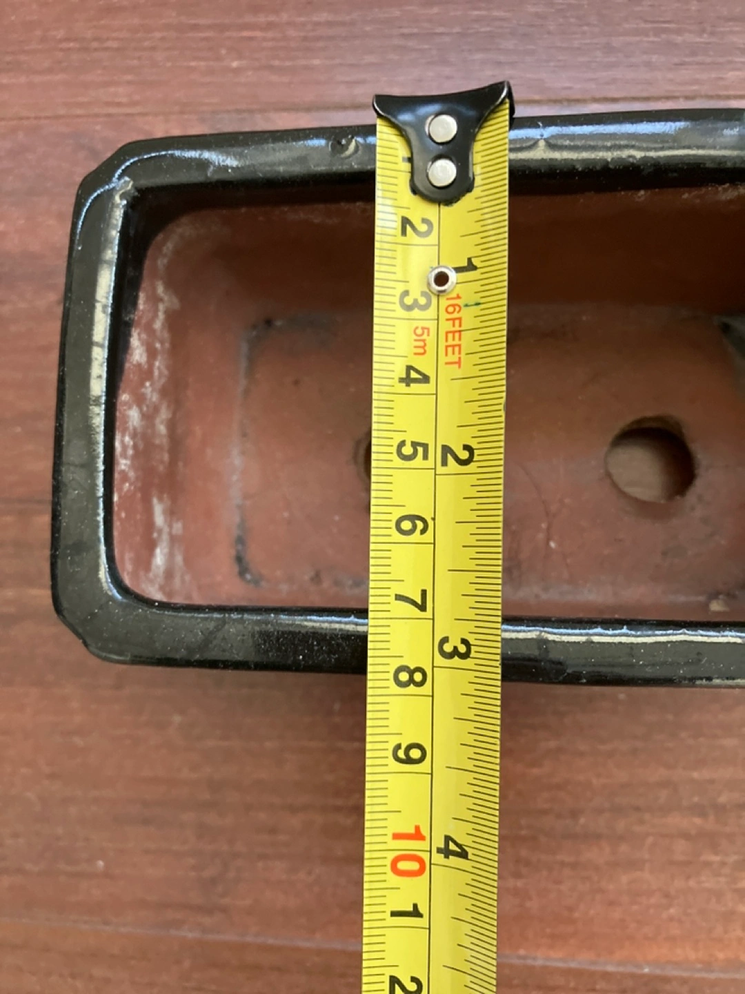 Three plant pots. One white pot with a Christmas design, one black rectangular pot, and one white pot with a geometric pattern.