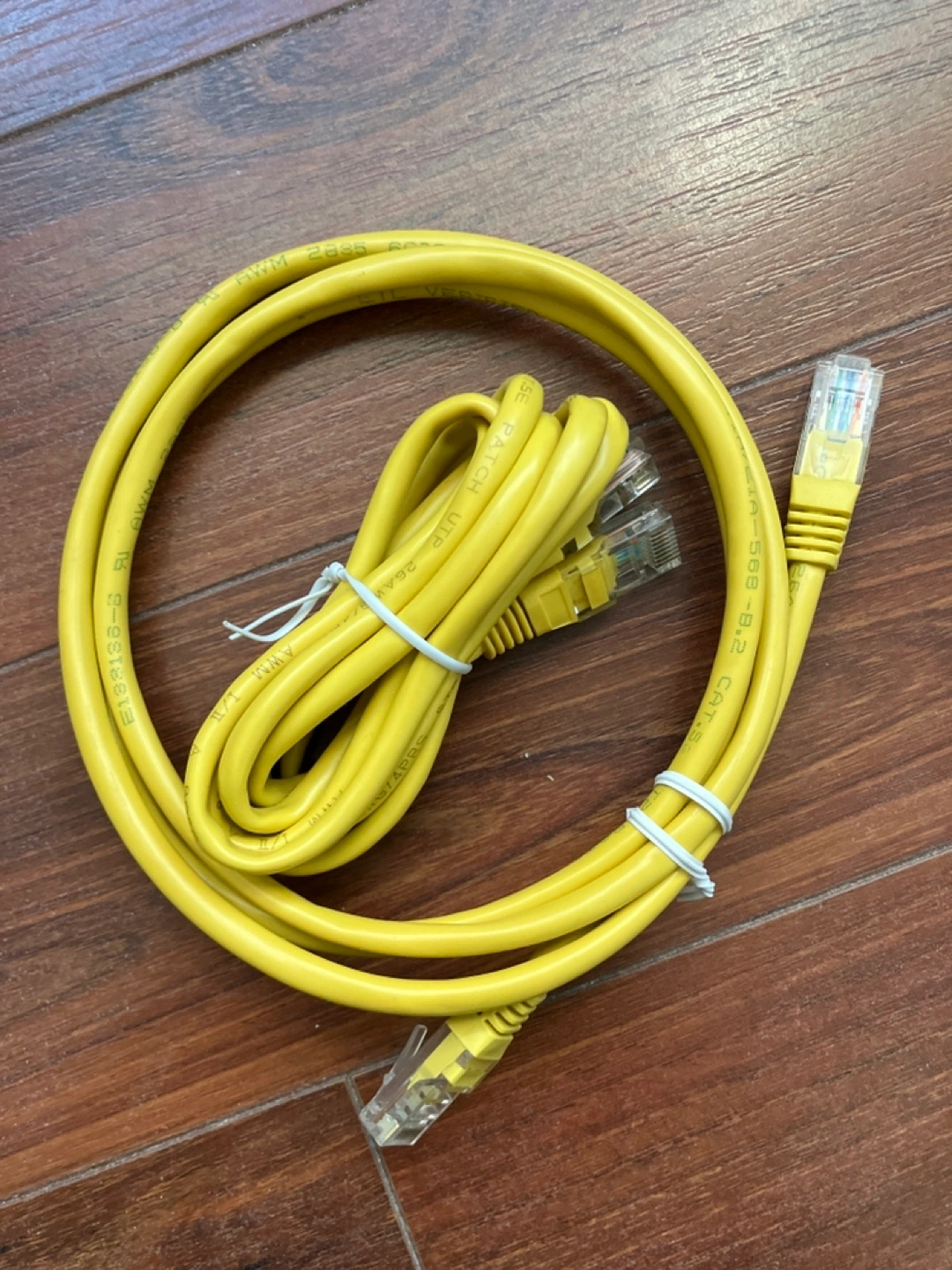 Coaxial cable and ethernet cables. Three cables in total. White cable has coaxial connectors. Yellow and grey cables have ethernet connectors.