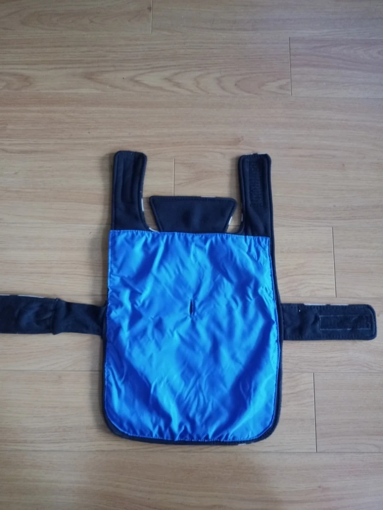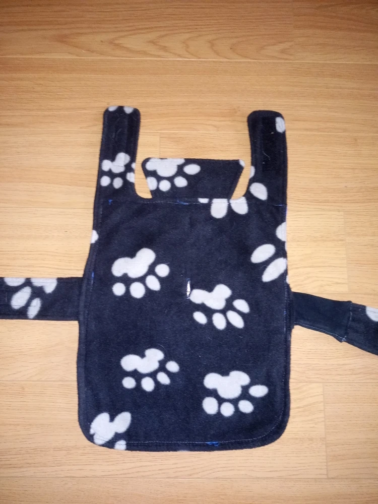Fleece dog coat with blue water-resistant side and paw print design. Has velcro closures. Back is 14"/35 cm and chest strap is 26"/66 cm. Fits small dog about 15-20 lbs. Our pup outgrew this so didn't get to use it much.