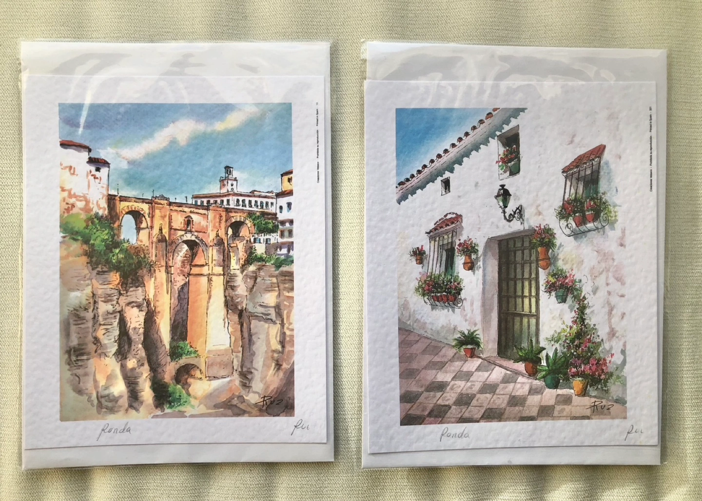 Two beautiful lithographs depicting scenes from Ronda, Spain. The lithographs are printed on acid-free textured card stock.