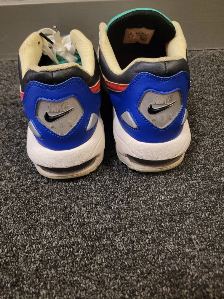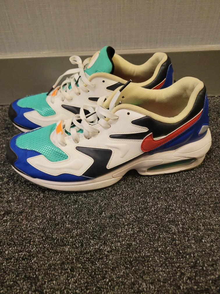 The The Nike Air Max 2 Light SP 'Sail Obsidian Blue' sneaker revisits the 90s classic, putting emphasis on the design lines with a color-blocked approach. The theme is played out with a palette of Obsidian, Sail, Racer Blue, teal, red, yellow and white—rendered in layers of mesh and leather to balance airflow and support. Max Air cushioning underfoot teams up with foam for a responsive feel below. This shoe was released in a pack of two AM Light 2s in May 2019.