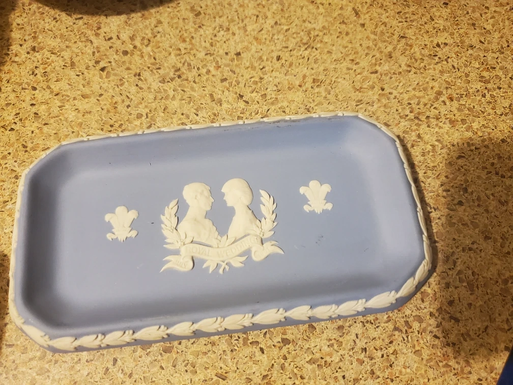 Small rectangular dish featuring a Royal Wedding design in white on a blue background. There are two Royal figures on the dish, along with a floral wreath and leaves.