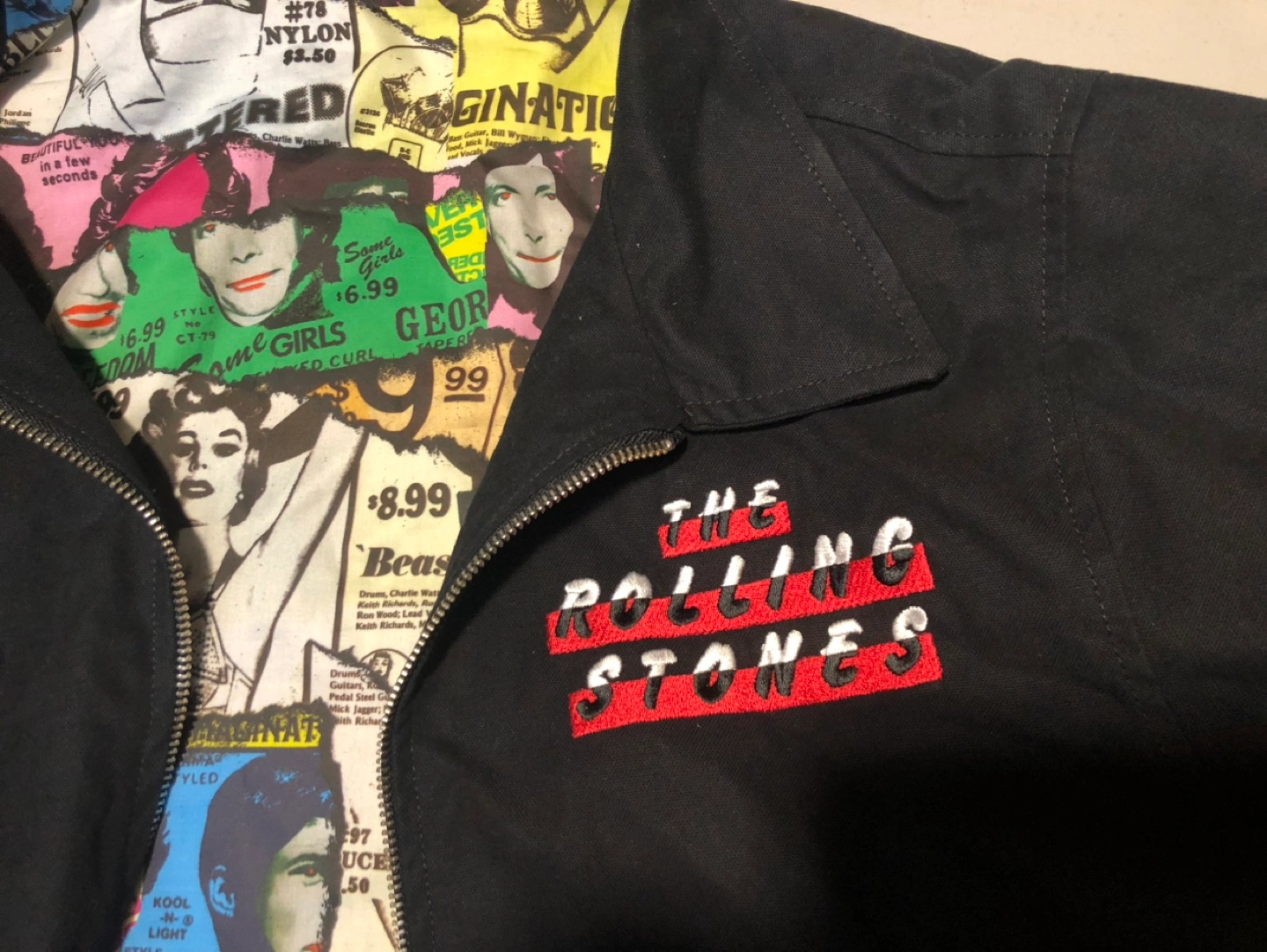 Black jacket with red and white 'The Rolling Stones' logo on the front and a red tongue with 'Some Girls' on the back. The inside lining has a pattern of various album covers.