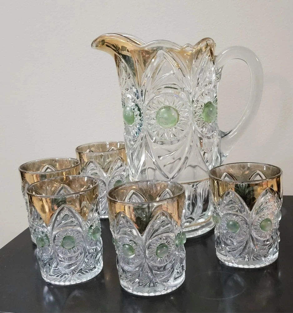 Set of 5 vintage glass tumblers and a pitcher. All pieces feature a beautiful cut-glass design with green accents.