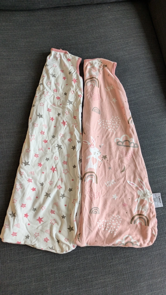 Two baby sleep sacks with Double Zipper . One is pink with a rainbow and bunny design, the other is white with stars. Size 12-18 months. 0.5TOG