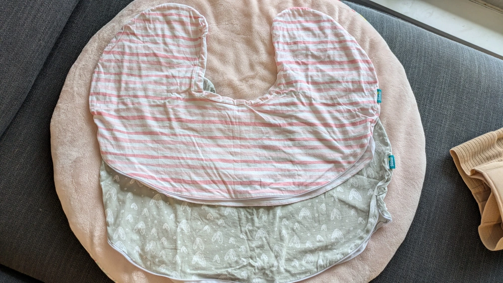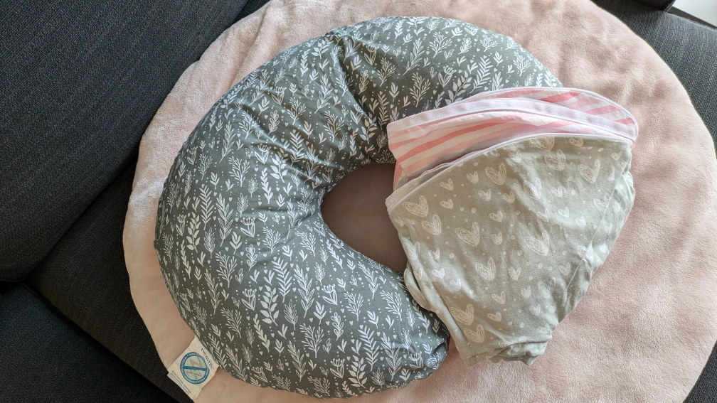 2 Biloban Nursing Pillow Cover Boys and Girls, Stretchy 100% Jersey Cotton. One cover is a gray and white floral pattern and the other is a pink and white stripe.