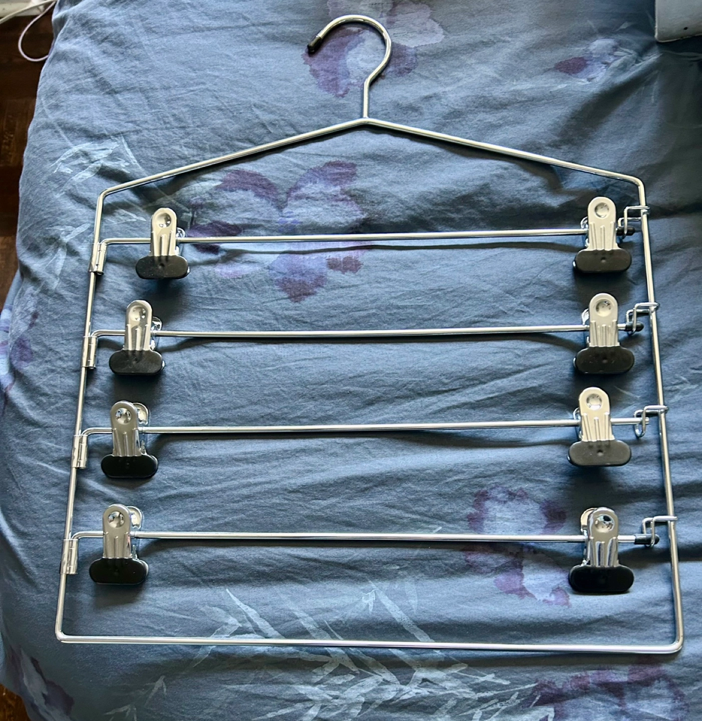 1000+Metal hanger with 5 tiers and clips. Good for organizing pants and skirts.