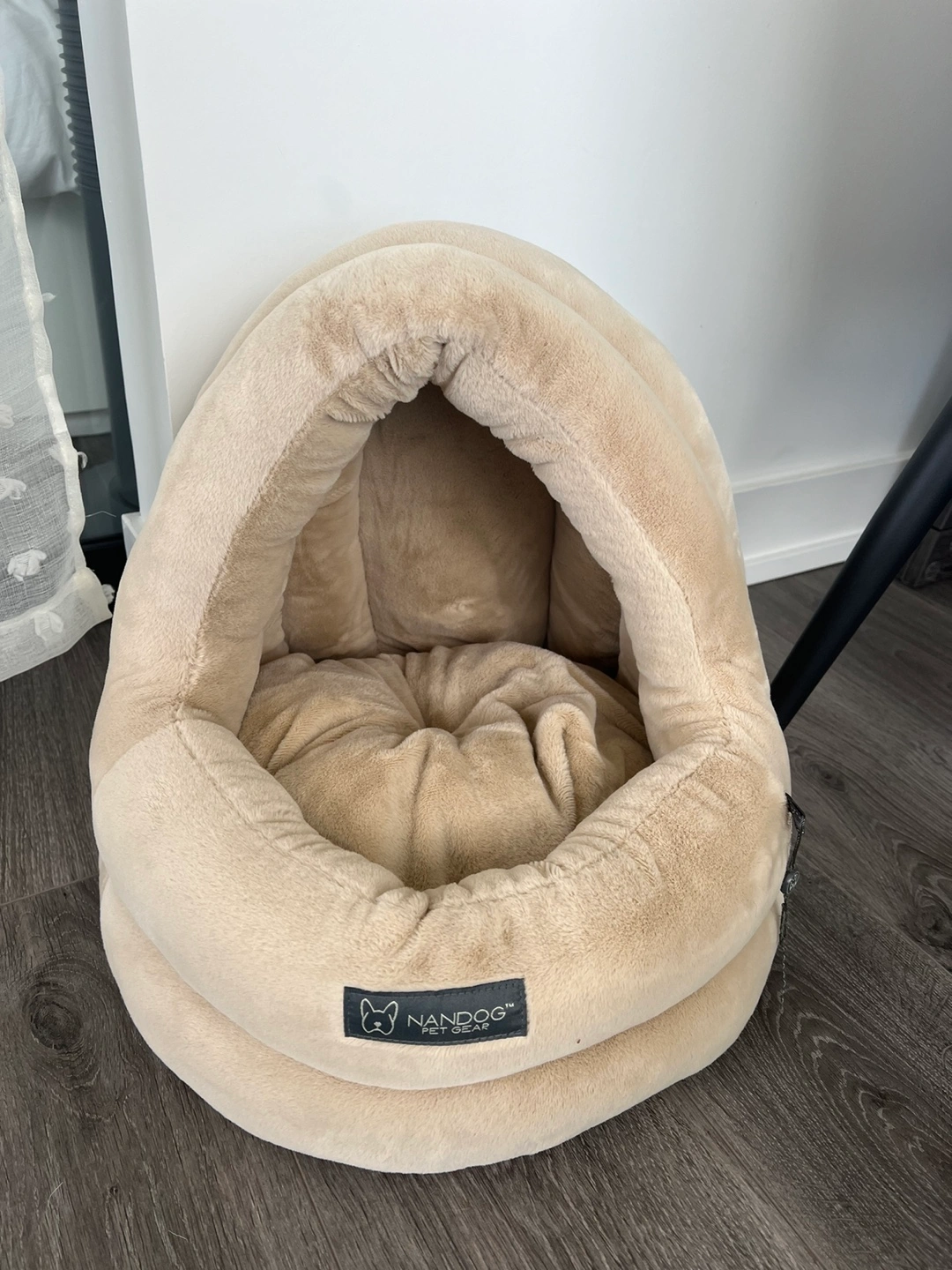A tiny pet bed with a removable cushion 🐾. Comes with a stainless steel food bowl. My puppy now likes to sleep in my bed instead of this.