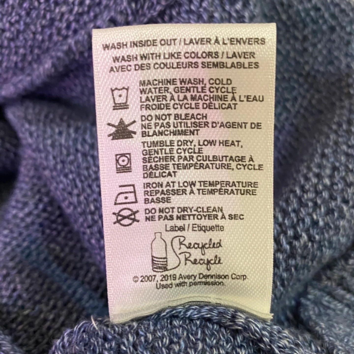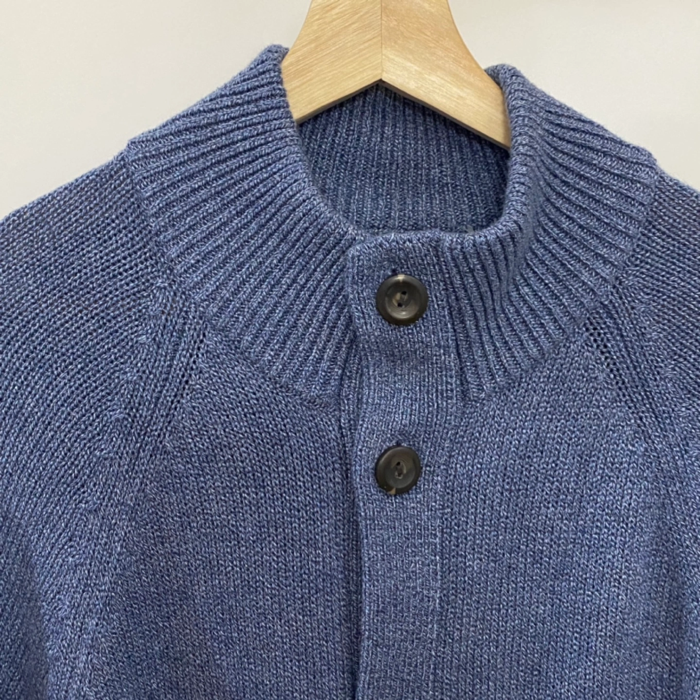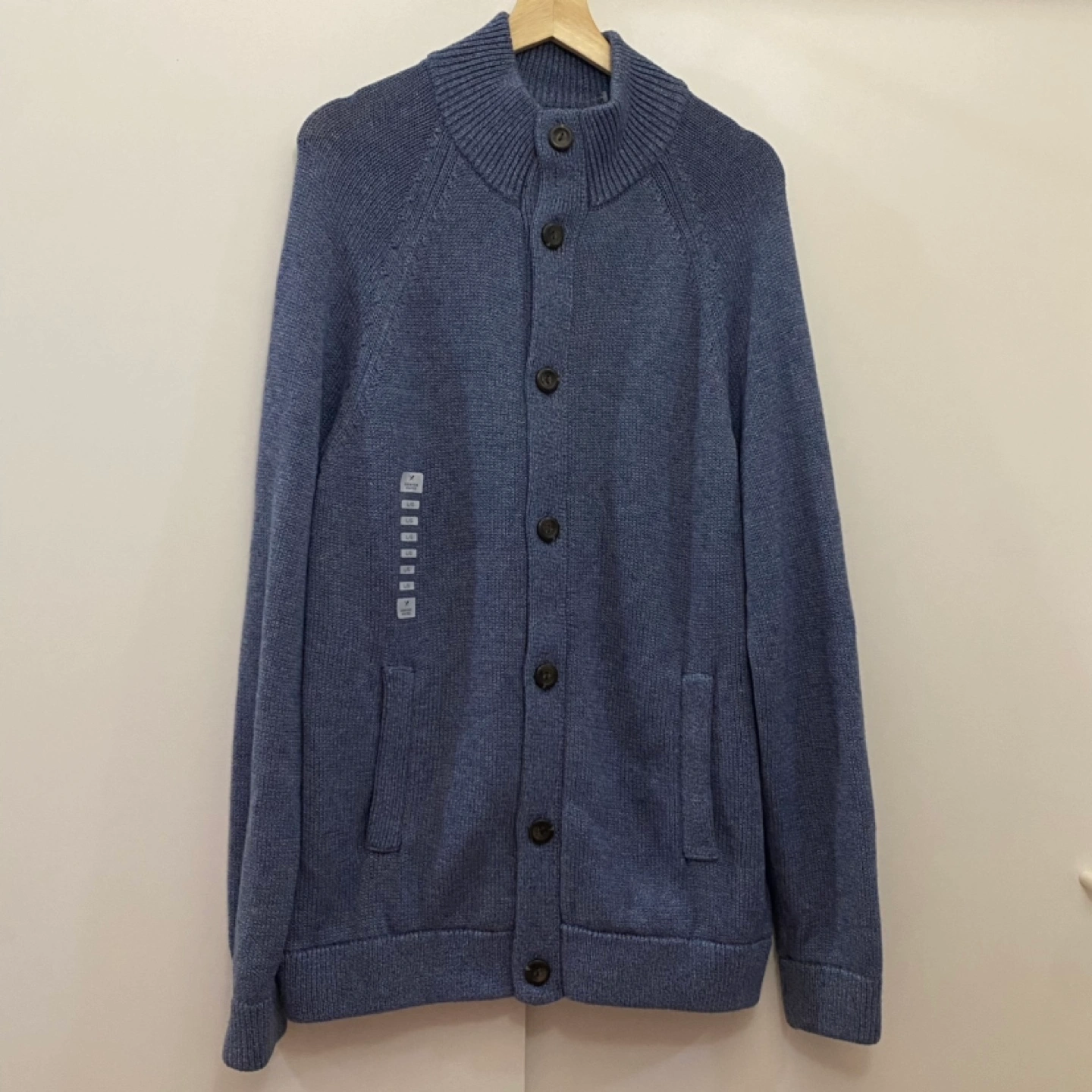 Blue cardigan sweater with button closure. Long sleeves. Two pockets.