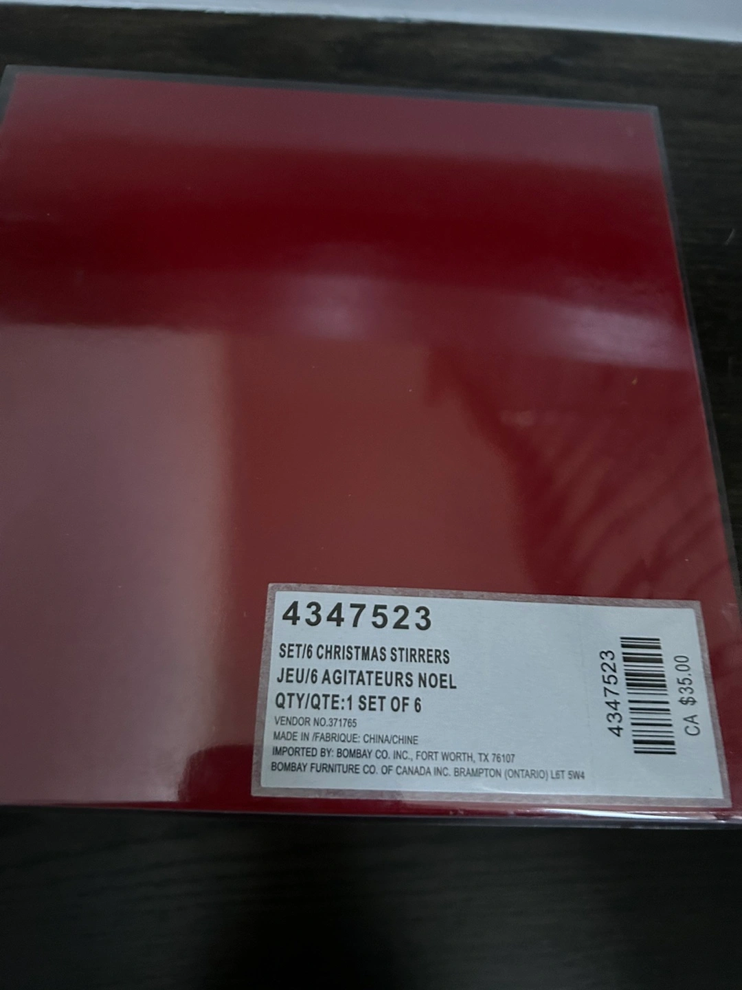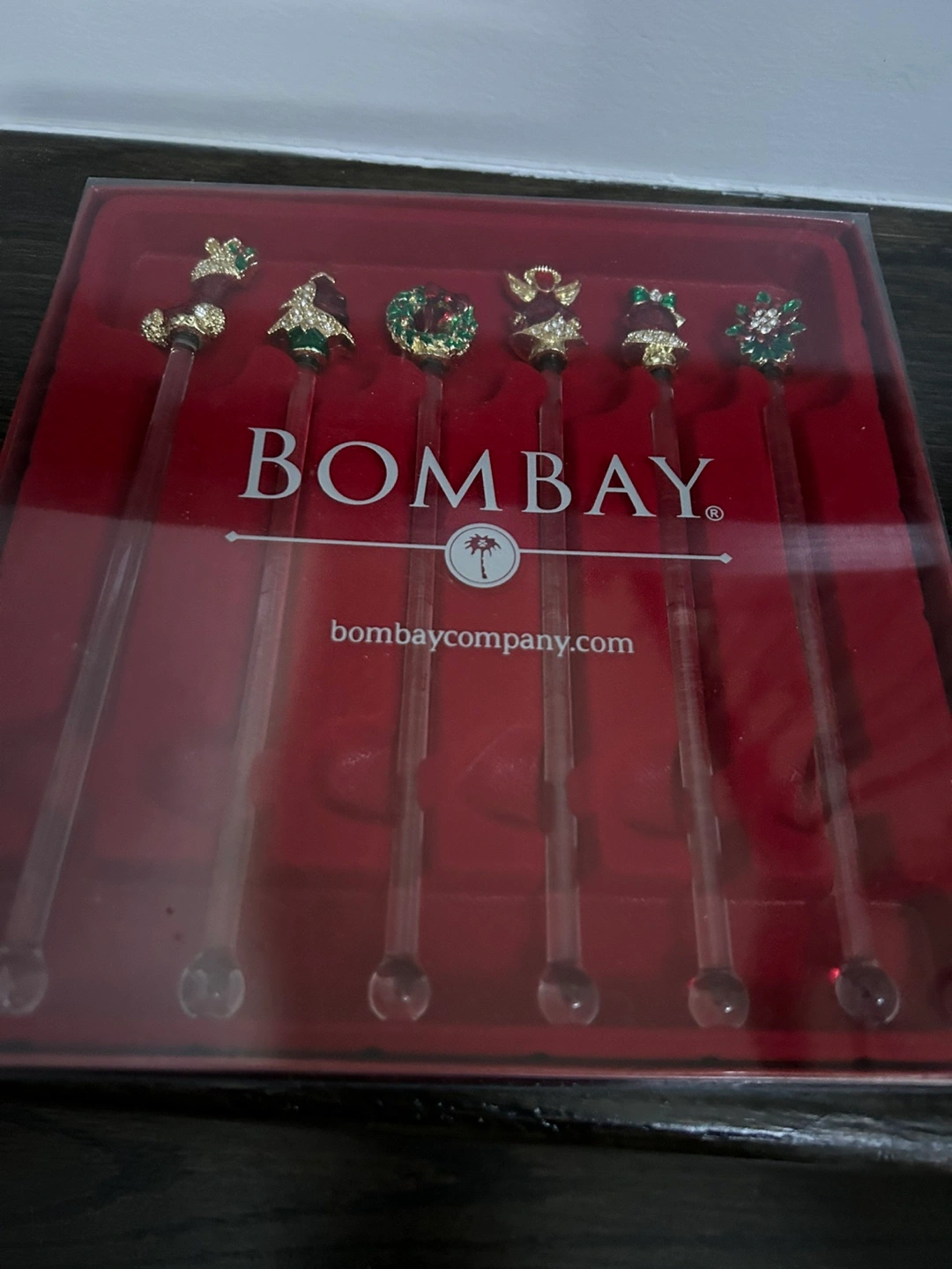91Set of six glass Christmas stirrers with various designs. Includes a stocking, tree, wreath, angel, bell, and poinsettia. In original packaging.
