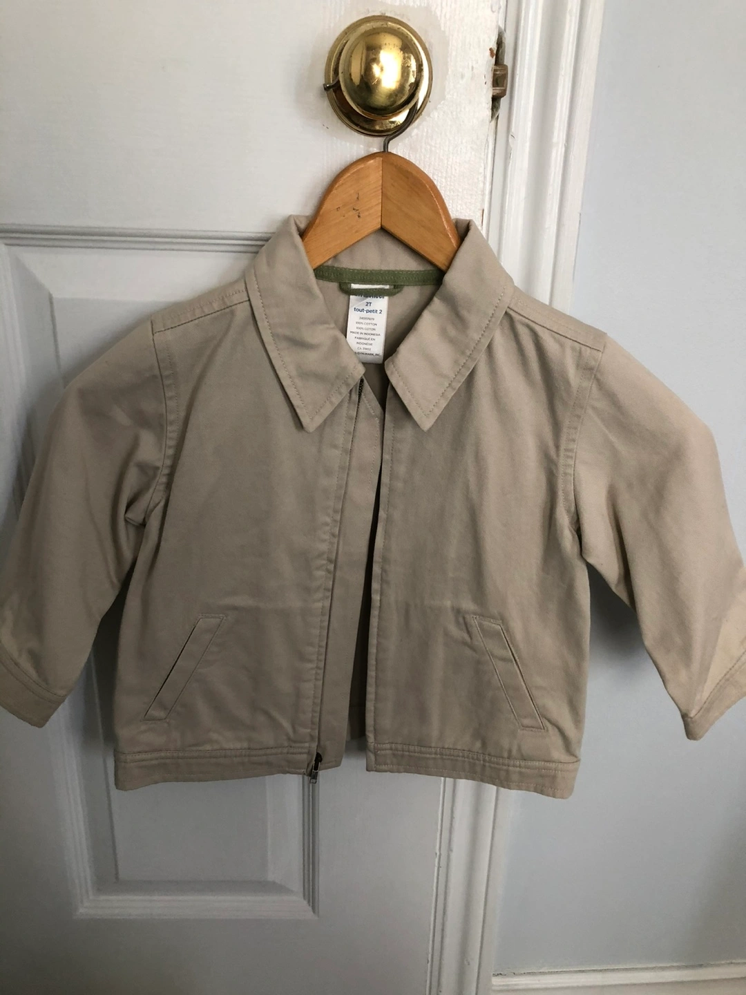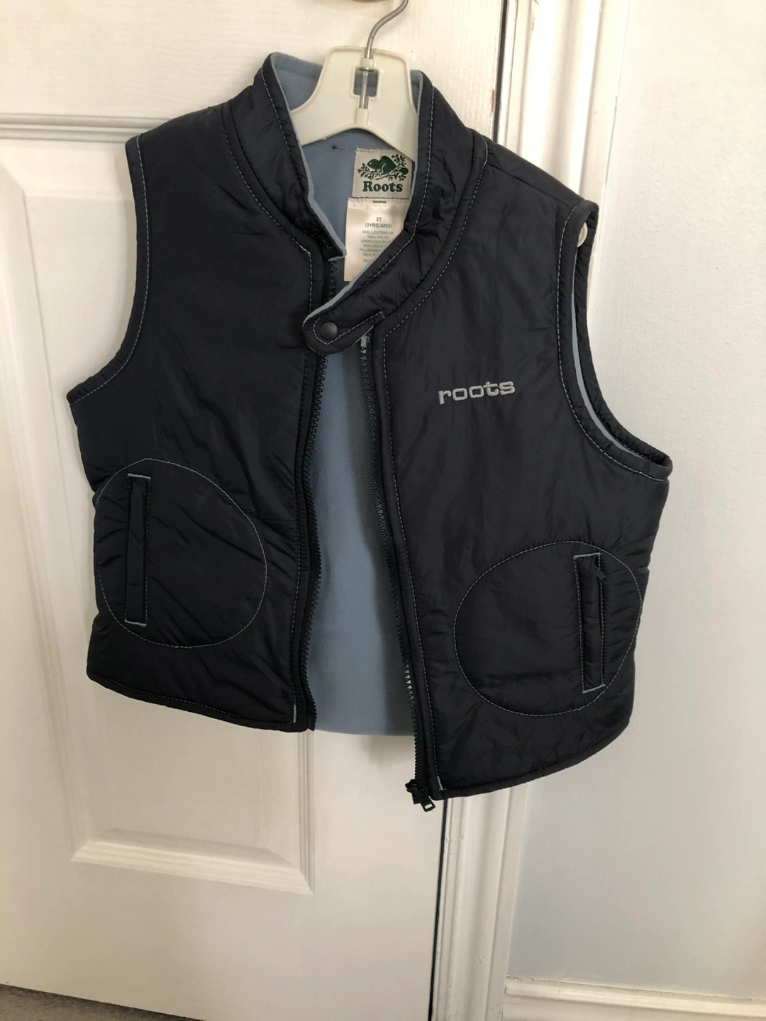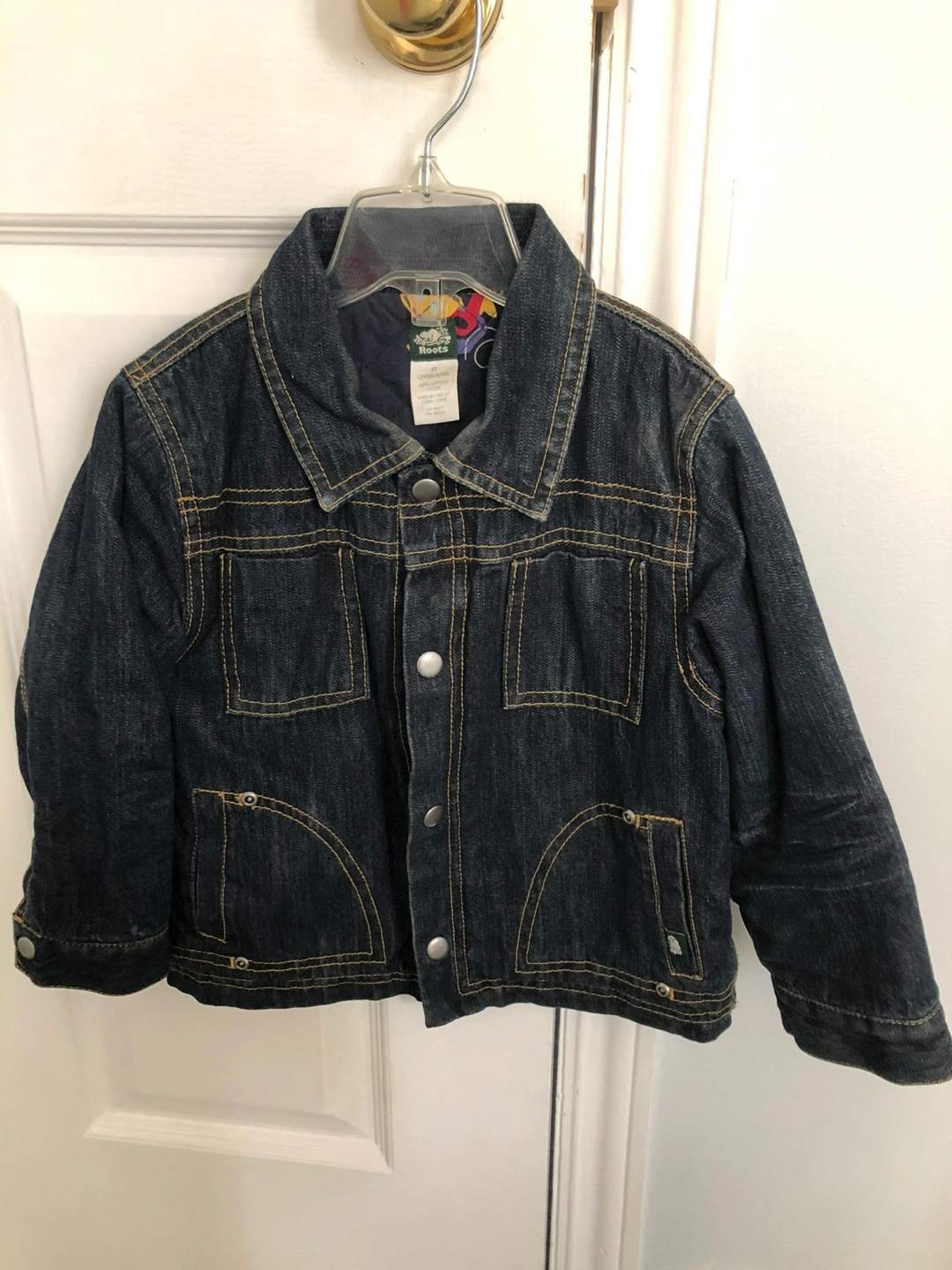 91Bundle of five Roots kids jackets and vests, all size 2T. Includes a beige corduroy jacket with a sherpa lining, a blue and green windbreaker, a denim jacket, a tan utility jacket, and a black vest. All in good condition. $10 each