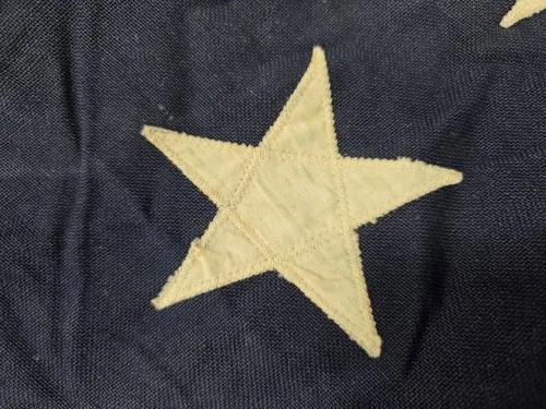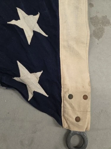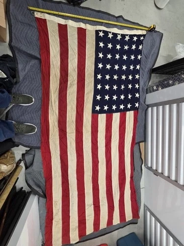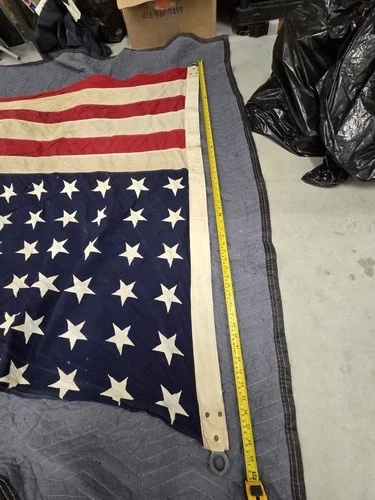 This is an authentic WWII era 48-star U.S. flag, measuring approximately 8 ft by 5 ft. It's made of cotton bunting with sewn, appliquéd stars featuring period machine zig-zag stitching and hand-sewn stripes. The flag has a heavy canvas hoist and metal grommets. It remains in original, unrestored condition with honest age wear, toning, and wrinkling consistent with its wartime use. No modern repairs or alterations have been made, and it has not been washed or cleaned. Let me know if you're interested!