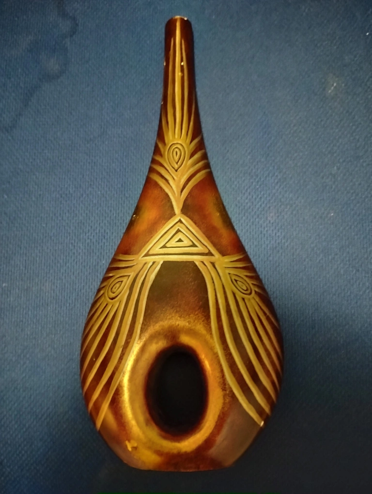 Ceramic vase with geometric design. Brown and gold.