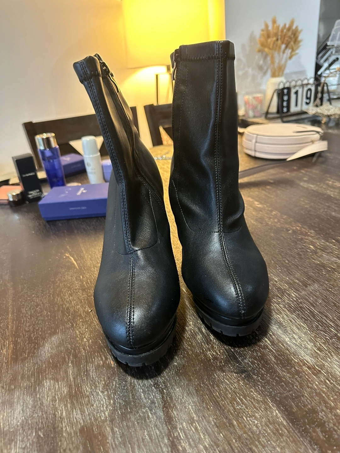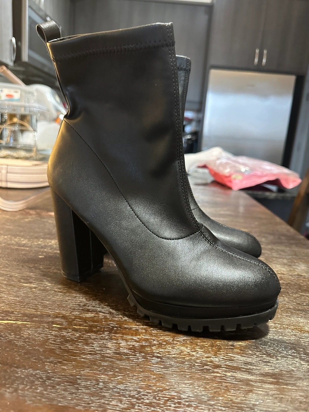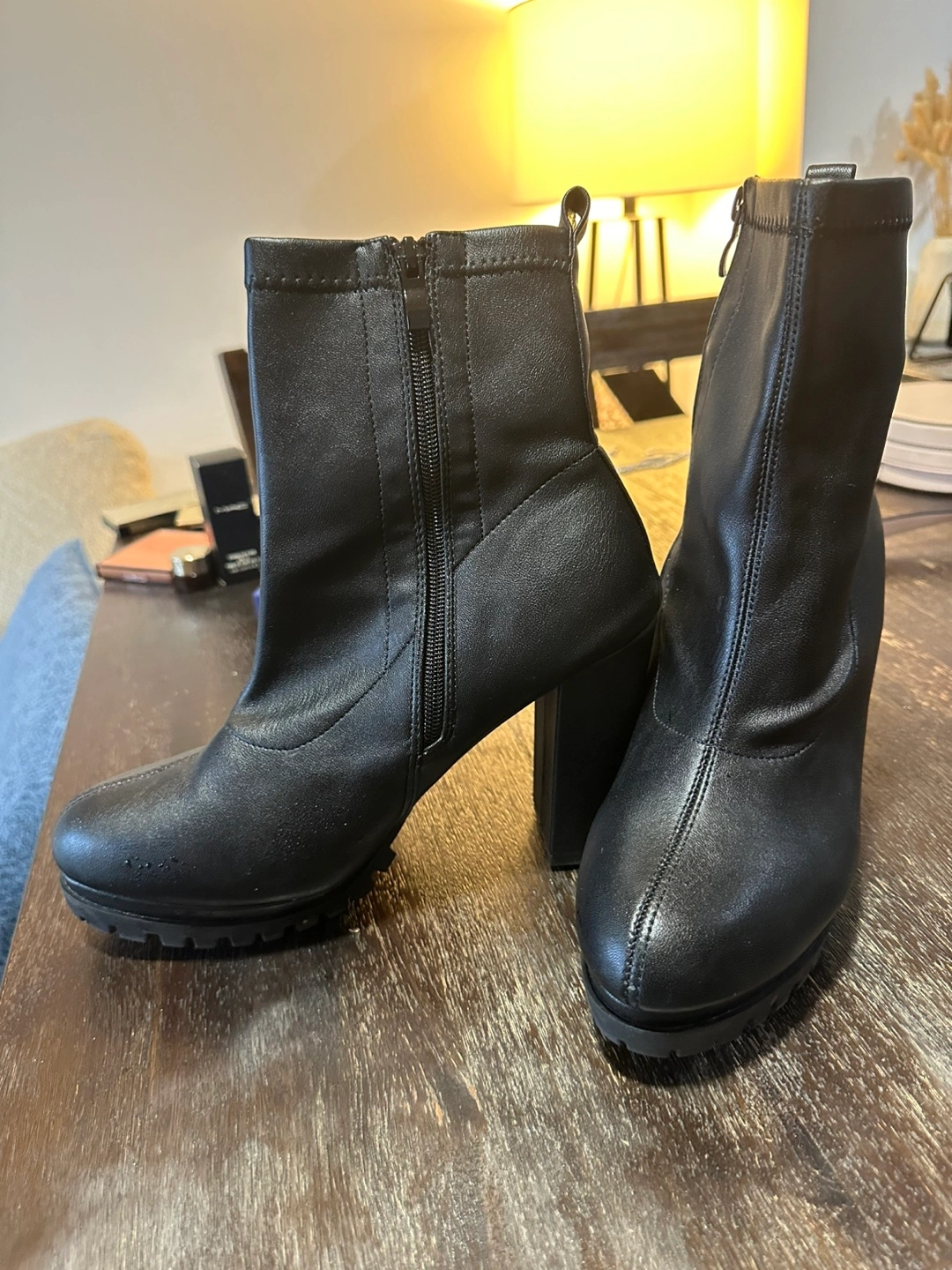 Black ankle boots with a block heel and a zipper on the side.